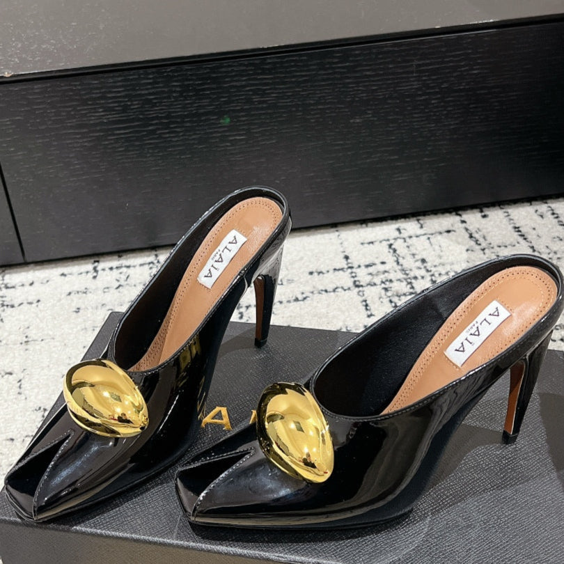 Alaia 25 Azzedine High Heels Mules With Gold Hardware Glossy Black Calfskin 293188