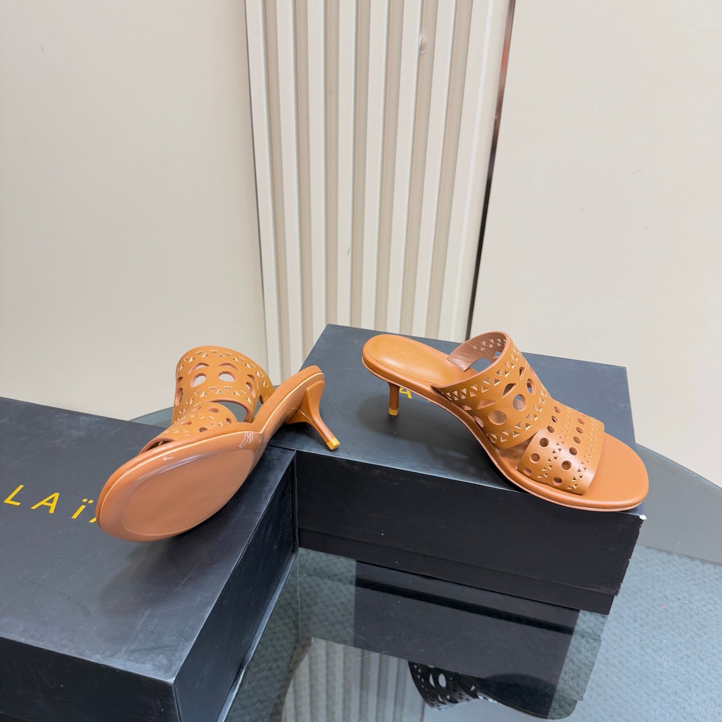 Alaia Vienne Cutout Kitten-Heel Slide Sandals Brown Sheepskin 299662