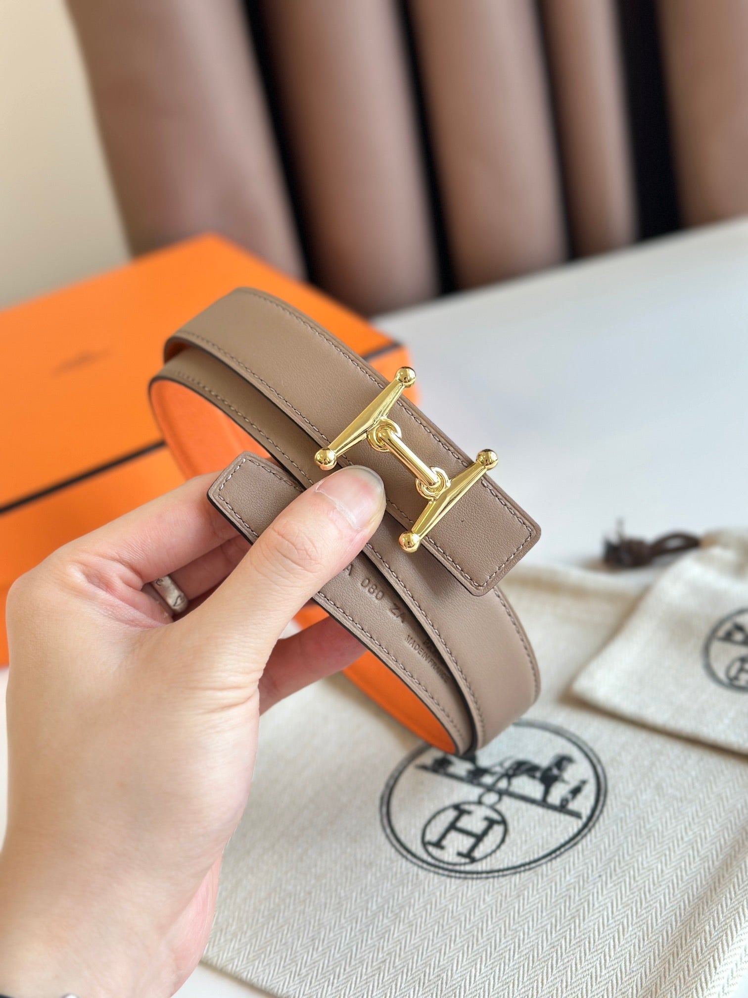 HM Gold Mors H buckle & Reversible 24 mm belt Orange Beige Leather 125355