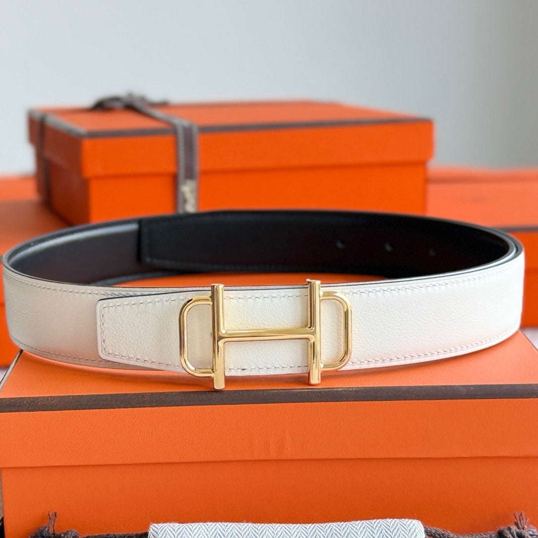 HM Gold H Buckle & Reversible 32mm Belt Beige mix Black leather 124654