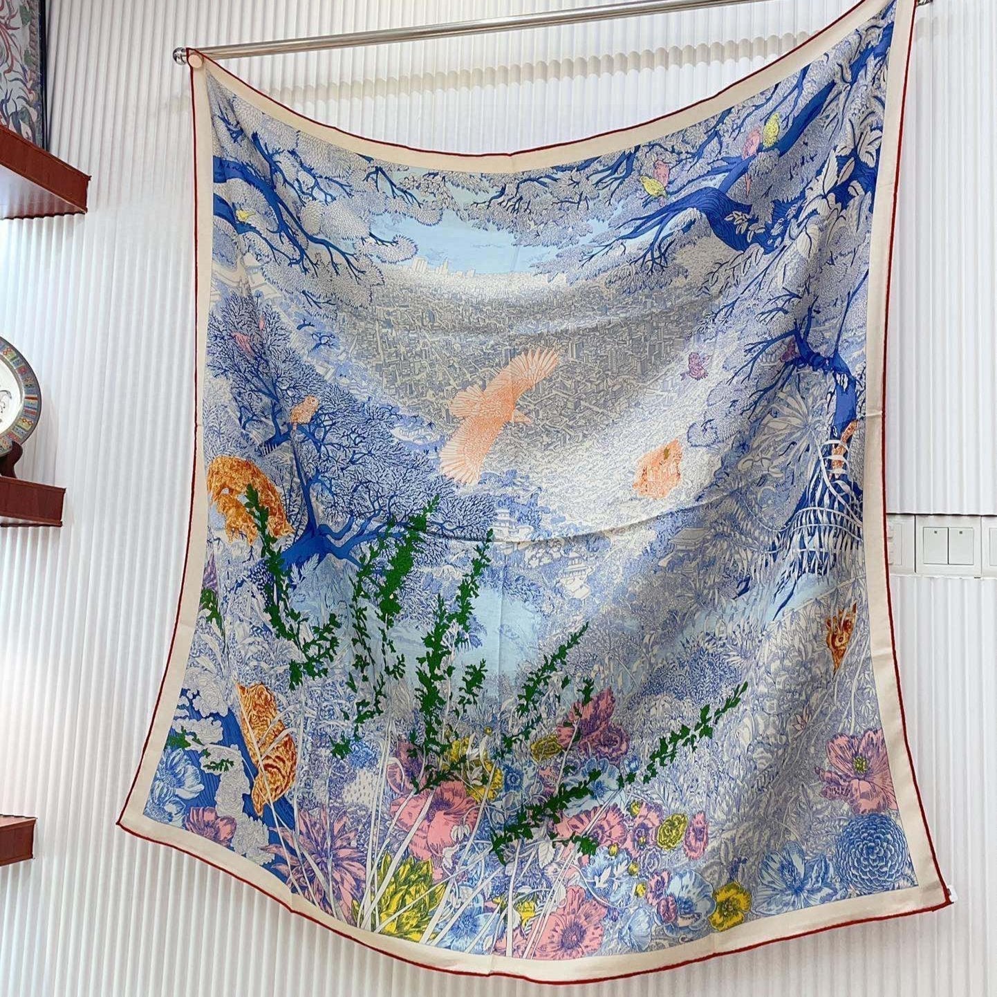 Square Scarf 140CM In Light Blue Colorful Cashmere And Silk