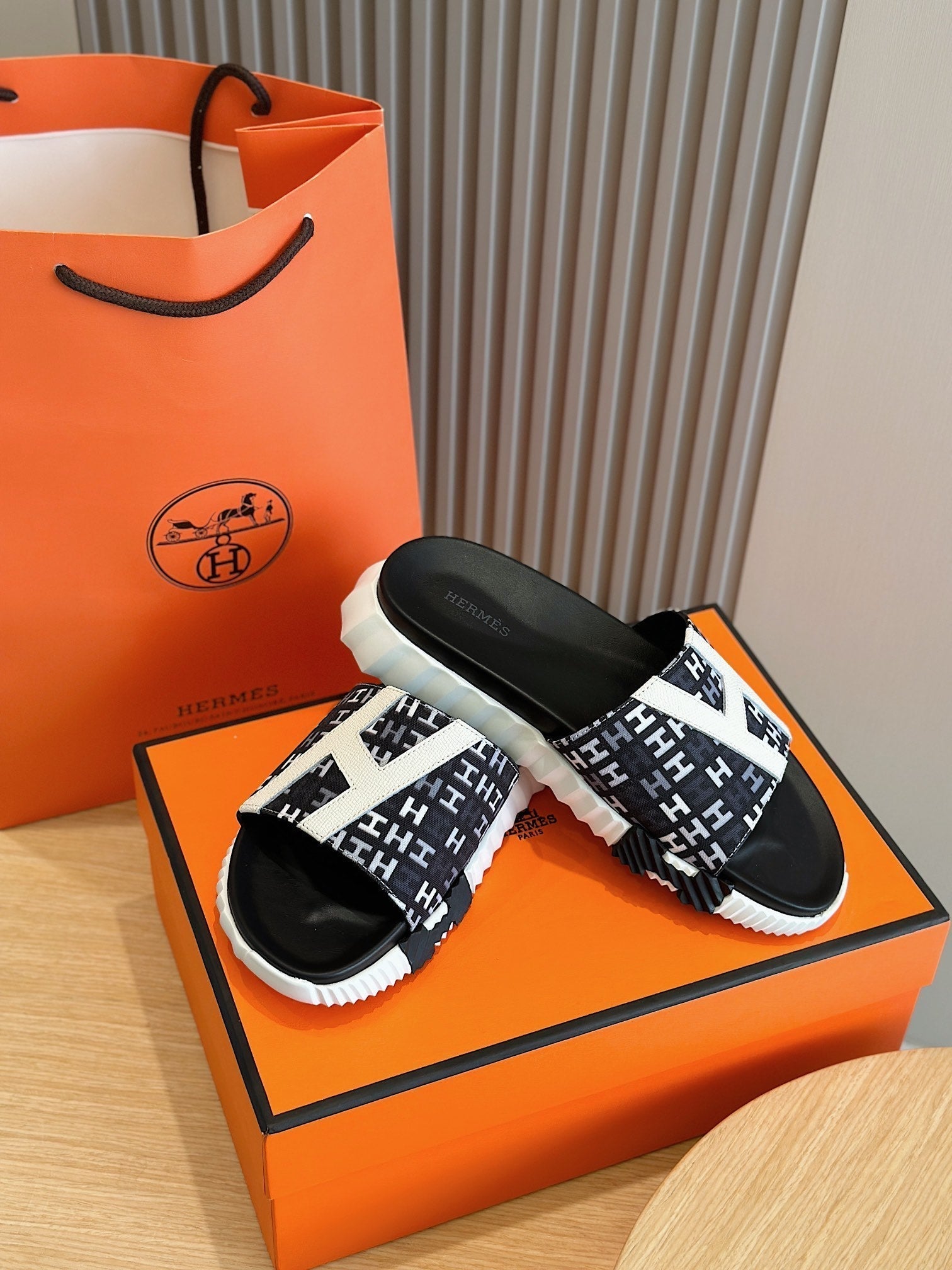 HM SLIPPERS BLACK MONOGRAM CANVAS