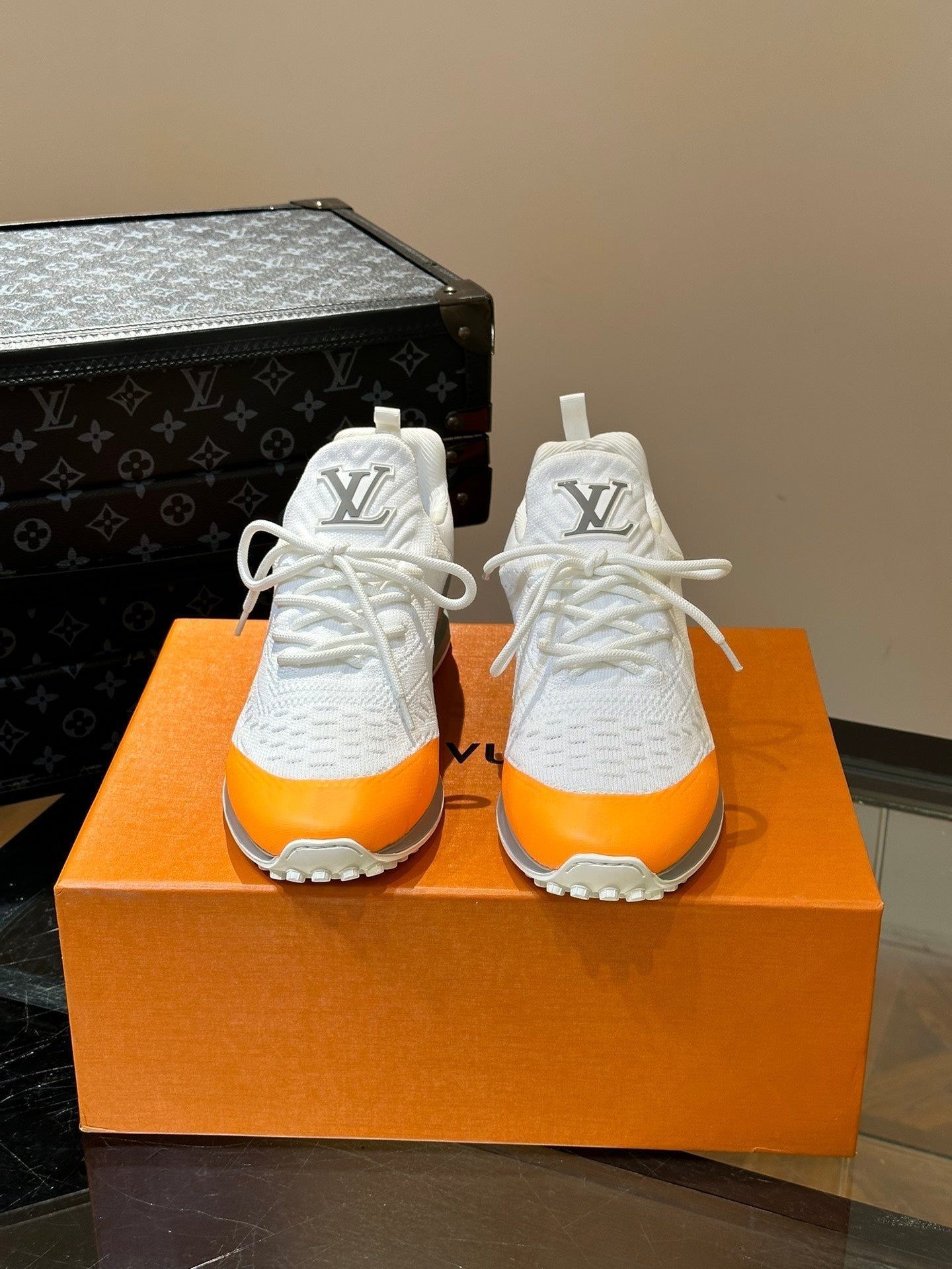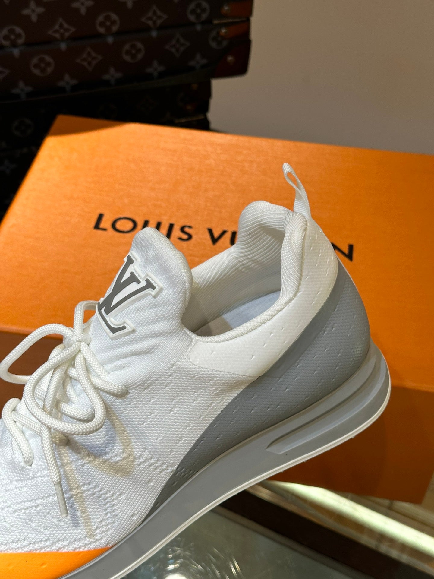 LV SNEAKERS IN GREY MIX WHITE MIX ORANGE CALFSKIN AND FABRIC BREATHABLE