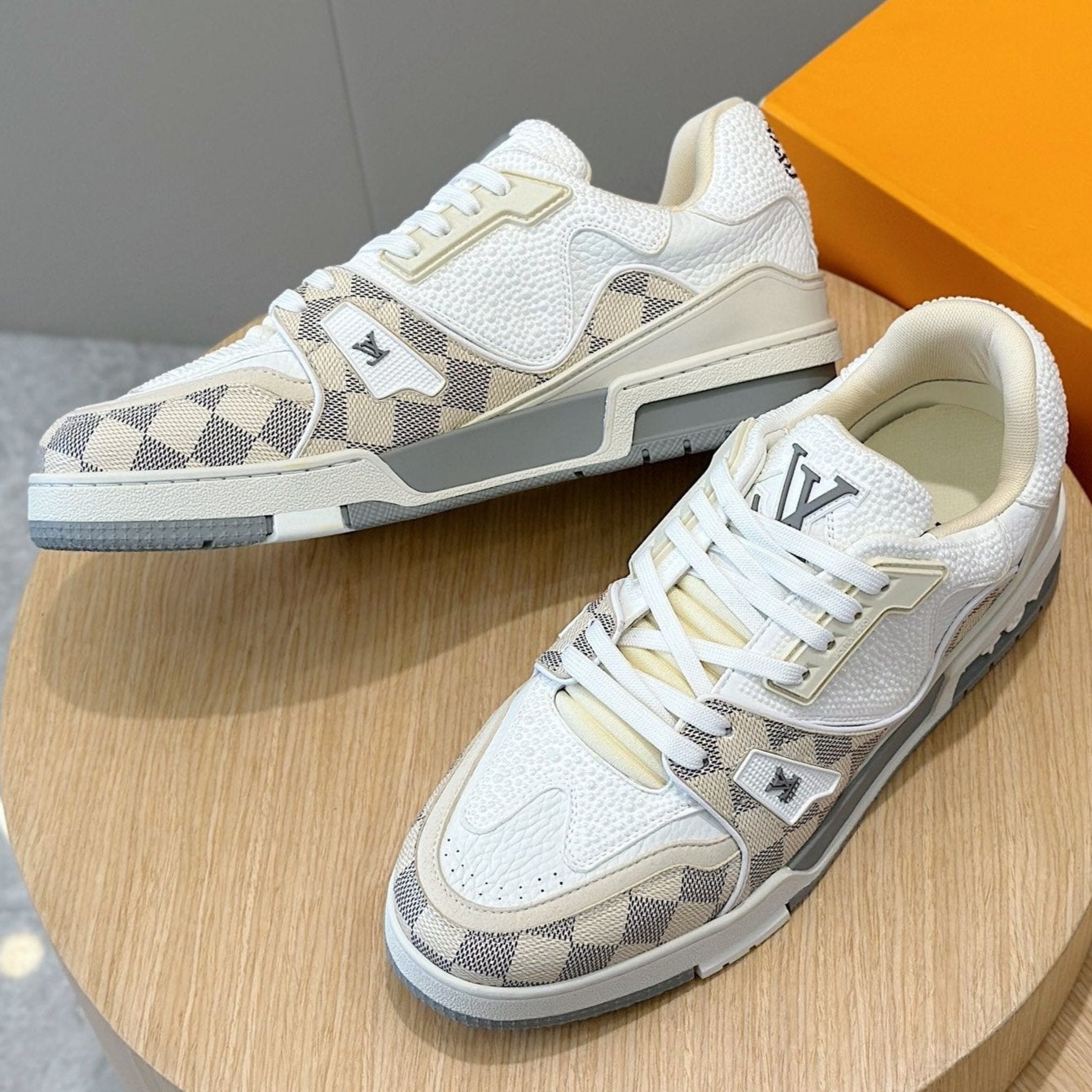 LV TRAINER BEIGE CREAM DAMIER MIX WHITE GRAINED CALFSKIN