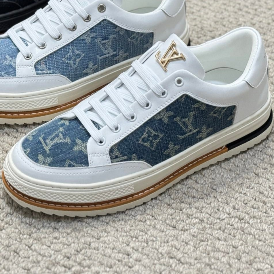 LV TRAINERS IN WHITE CALFSKIN AND BLUE DENIM JACQUARD