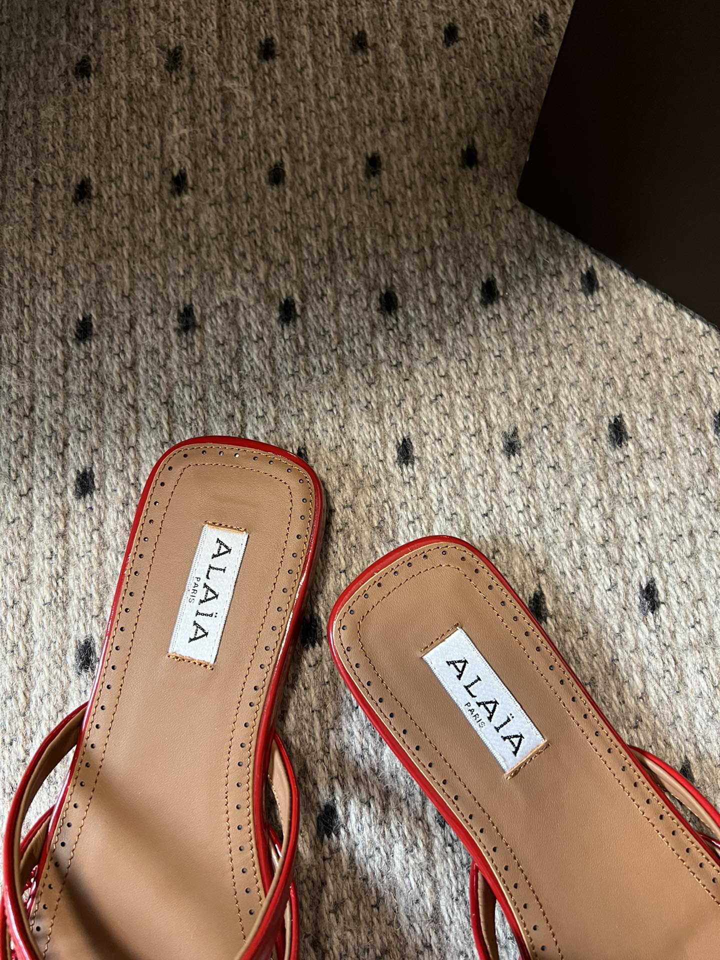 Alaia 25 Infradito Fishnet Flat Mules Red Lampskin 303710