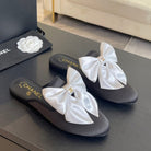 BIG BOW FLAT MULE SANDALS IN BLACK MIX WHITE SILK