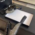 BIG BOW FLAT MULE SANDALS IN BLACK SILK WITH GLITTER SEQUINS