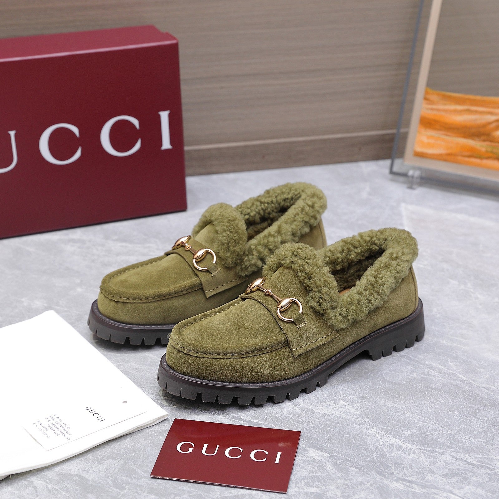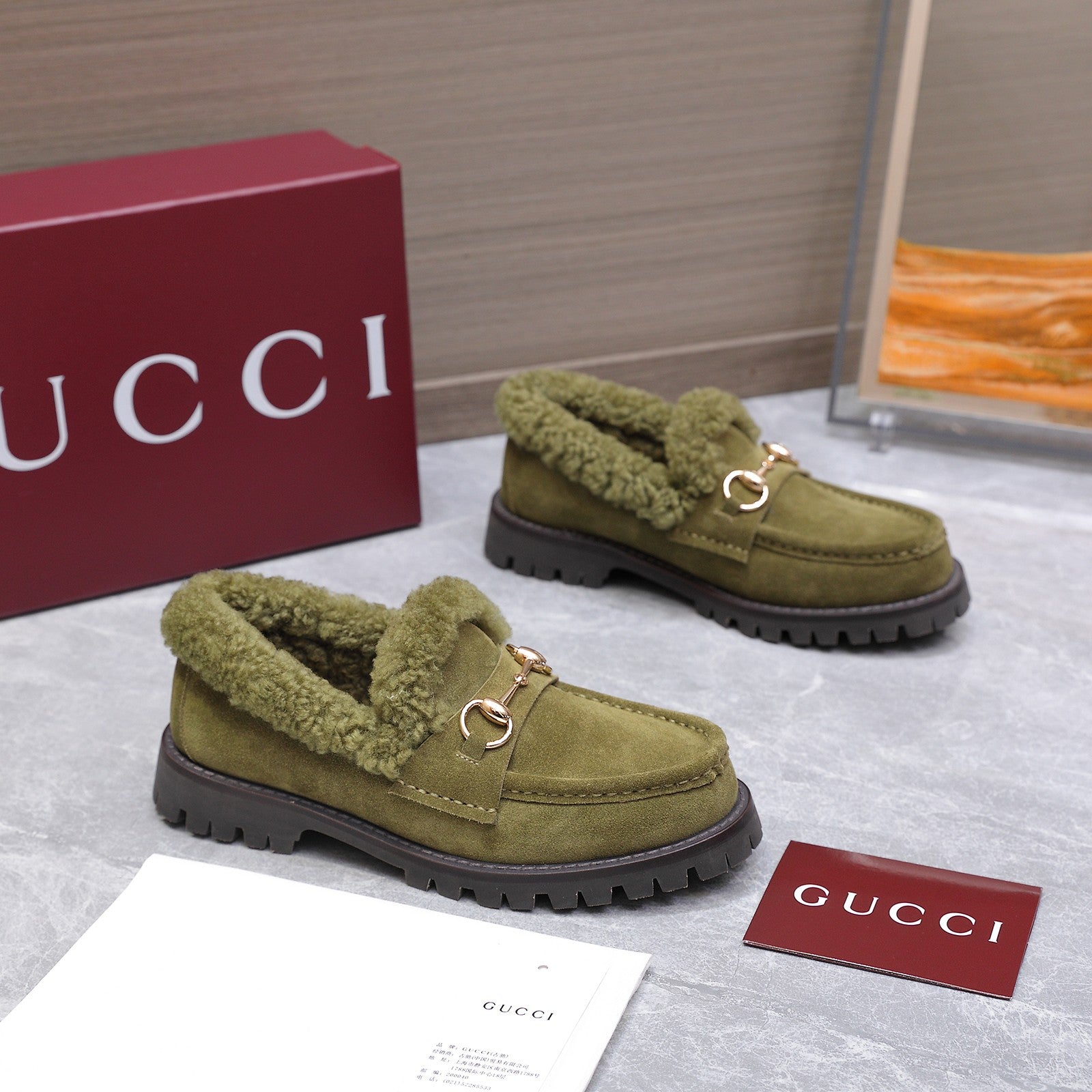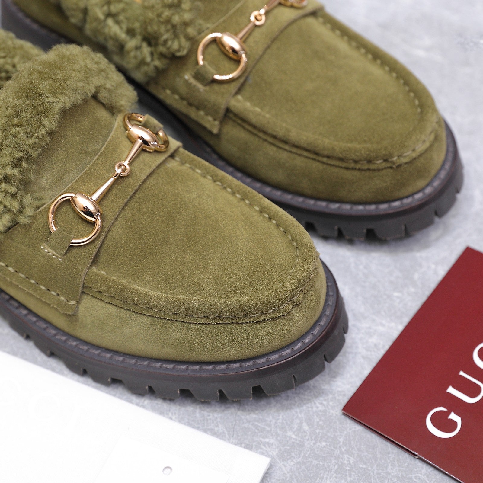 GG Women's Loafer Horsebit Olive Green Suede Shearing 547323