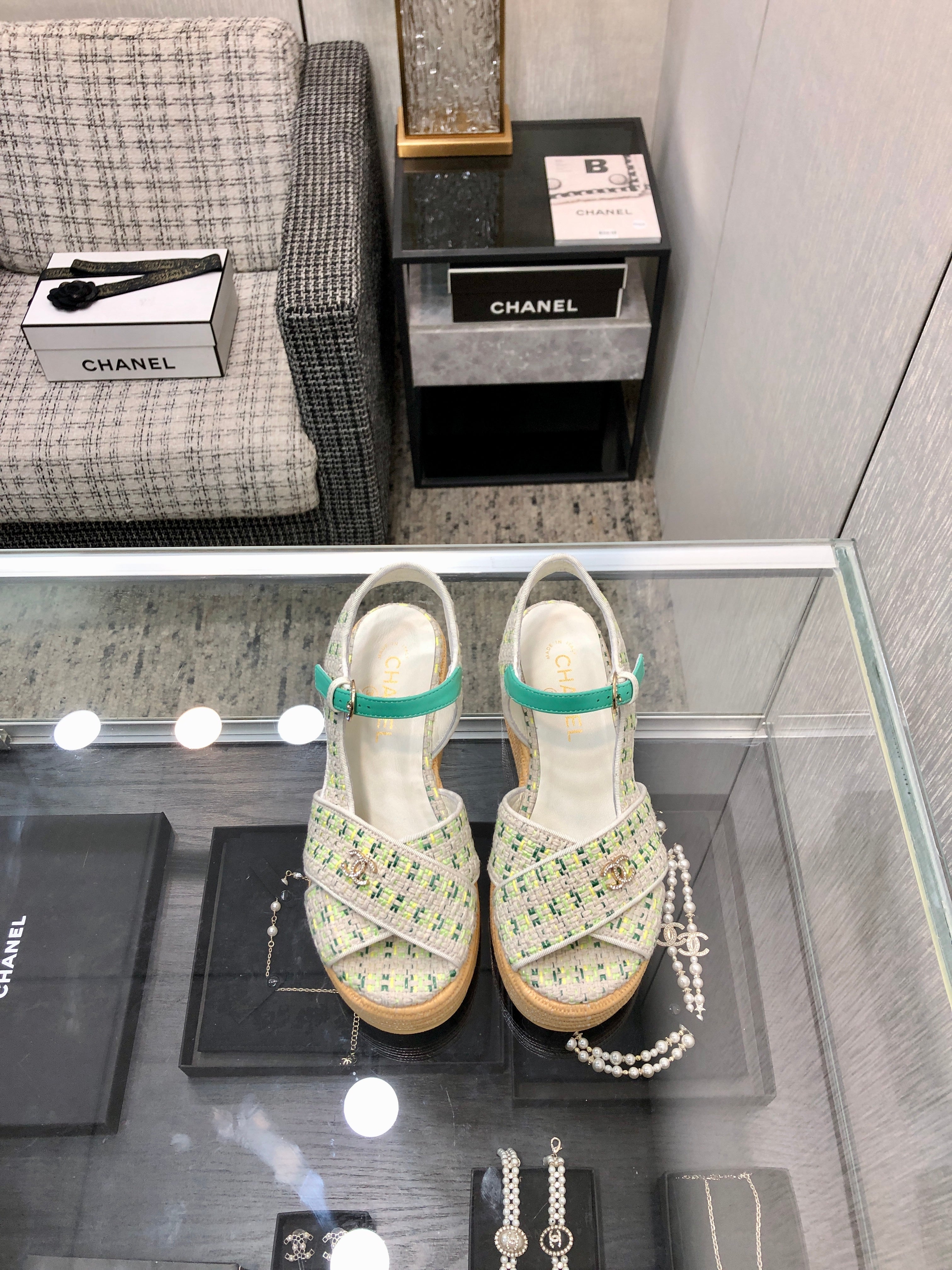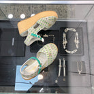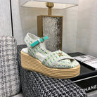 PEEP-TOE THICK SOLE SANDALS IN WHITE MIX TEA GREEN WOVEN FABRIC