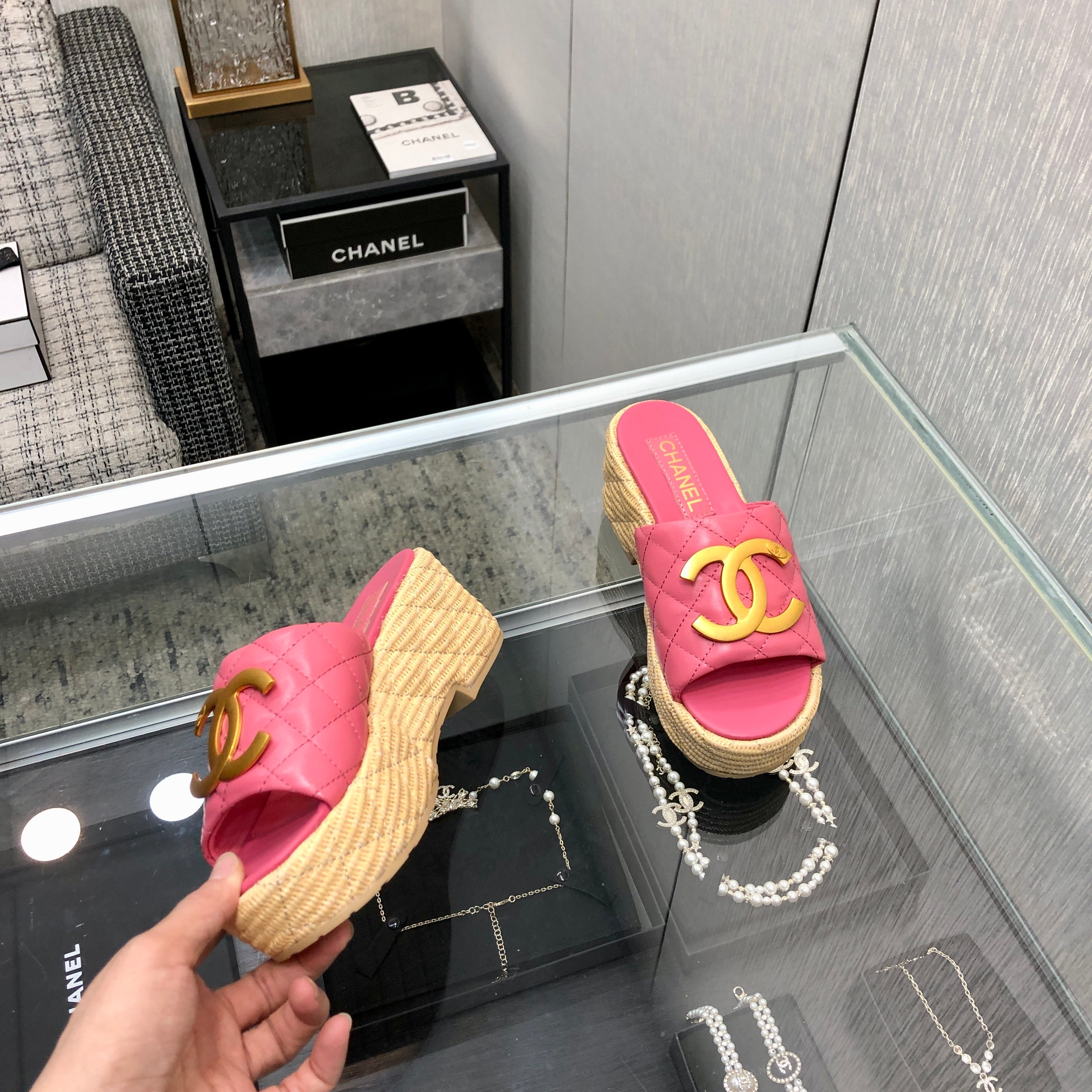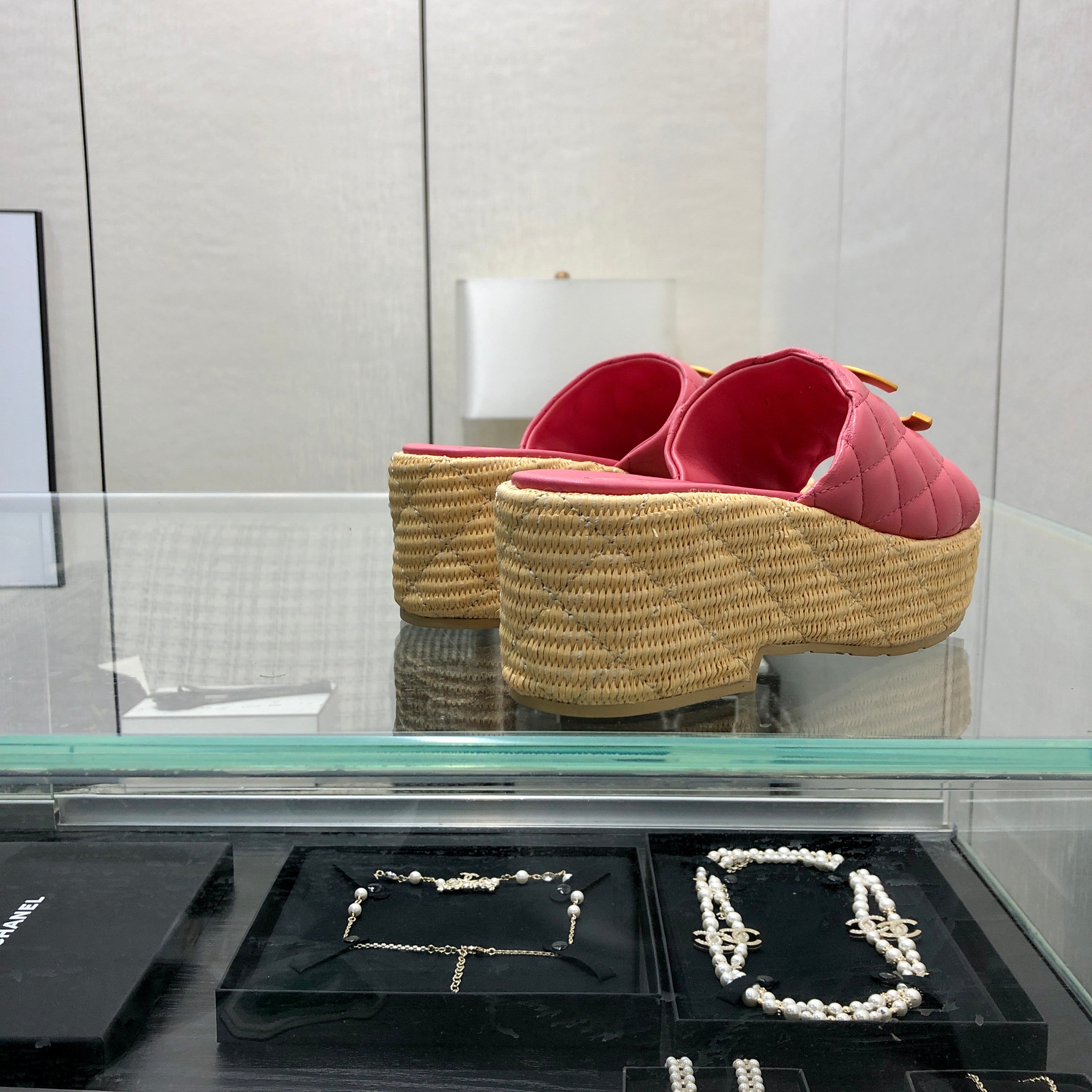 THICK SOLE WEDGE SLIPPERS IN PUNCH PINK LAMBSKIN AND BEIGE RUBBER