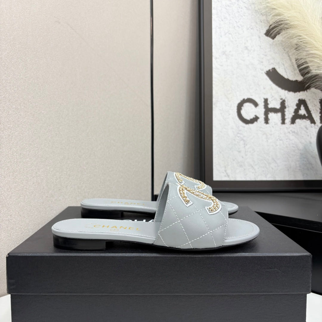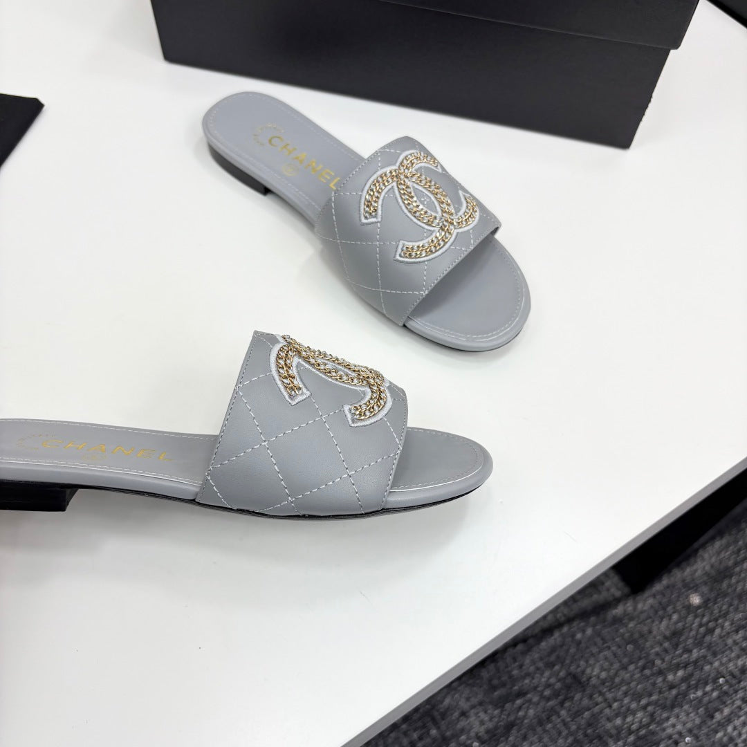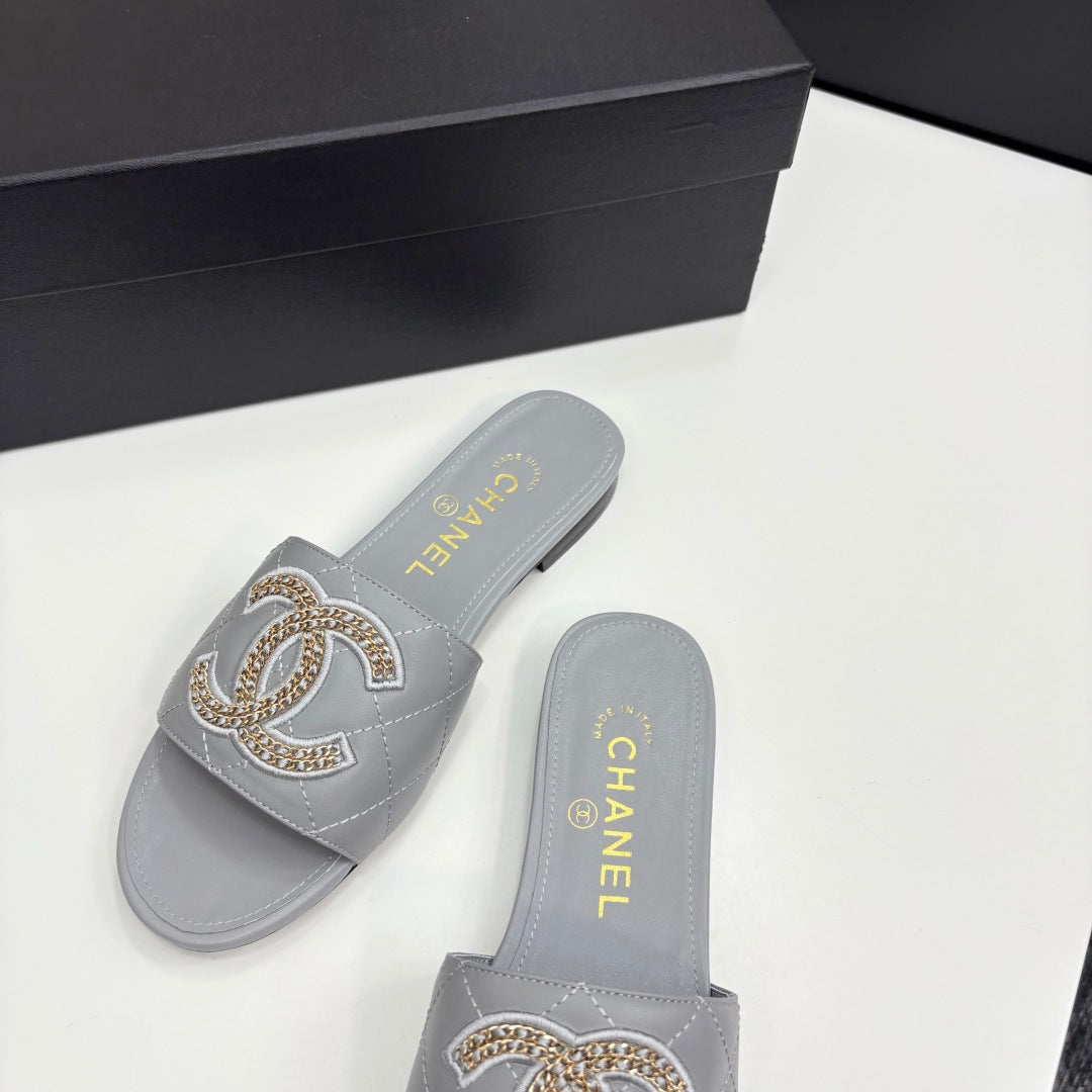 CC 25 Doubble Chain Embroidered Slippers Grey Quilted Sheepskin 352488