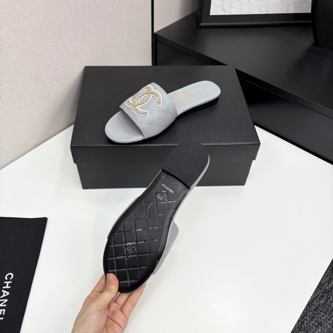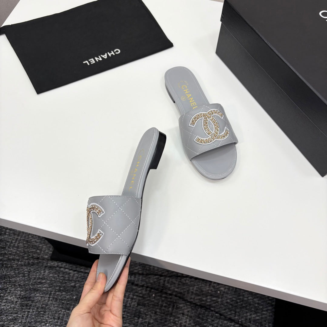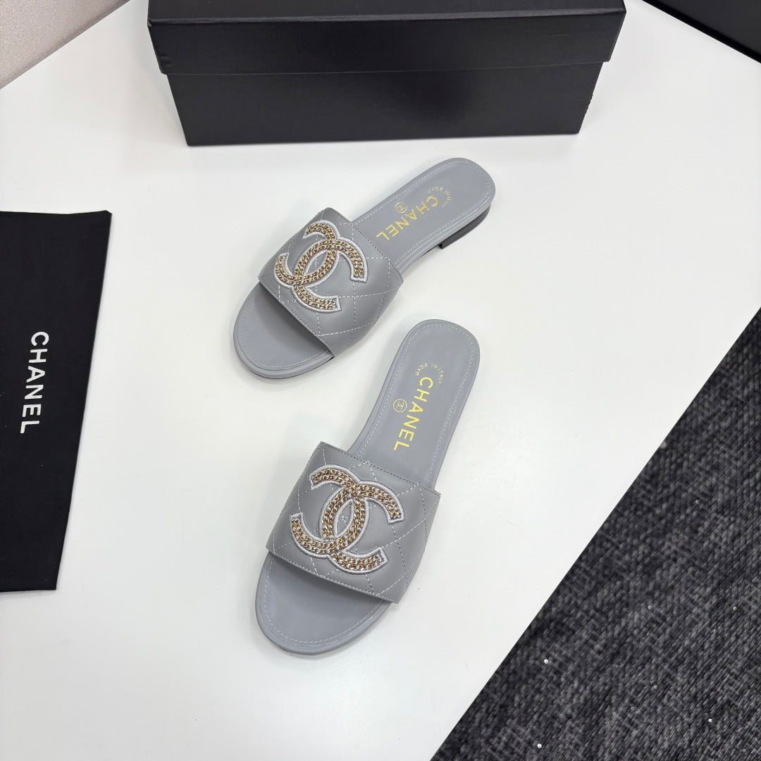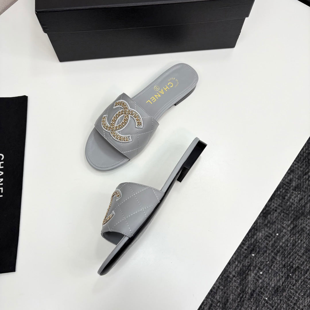 CC 25 Doubble Chain Embroidered Slippers Grey Quilted Sheepskin 352488