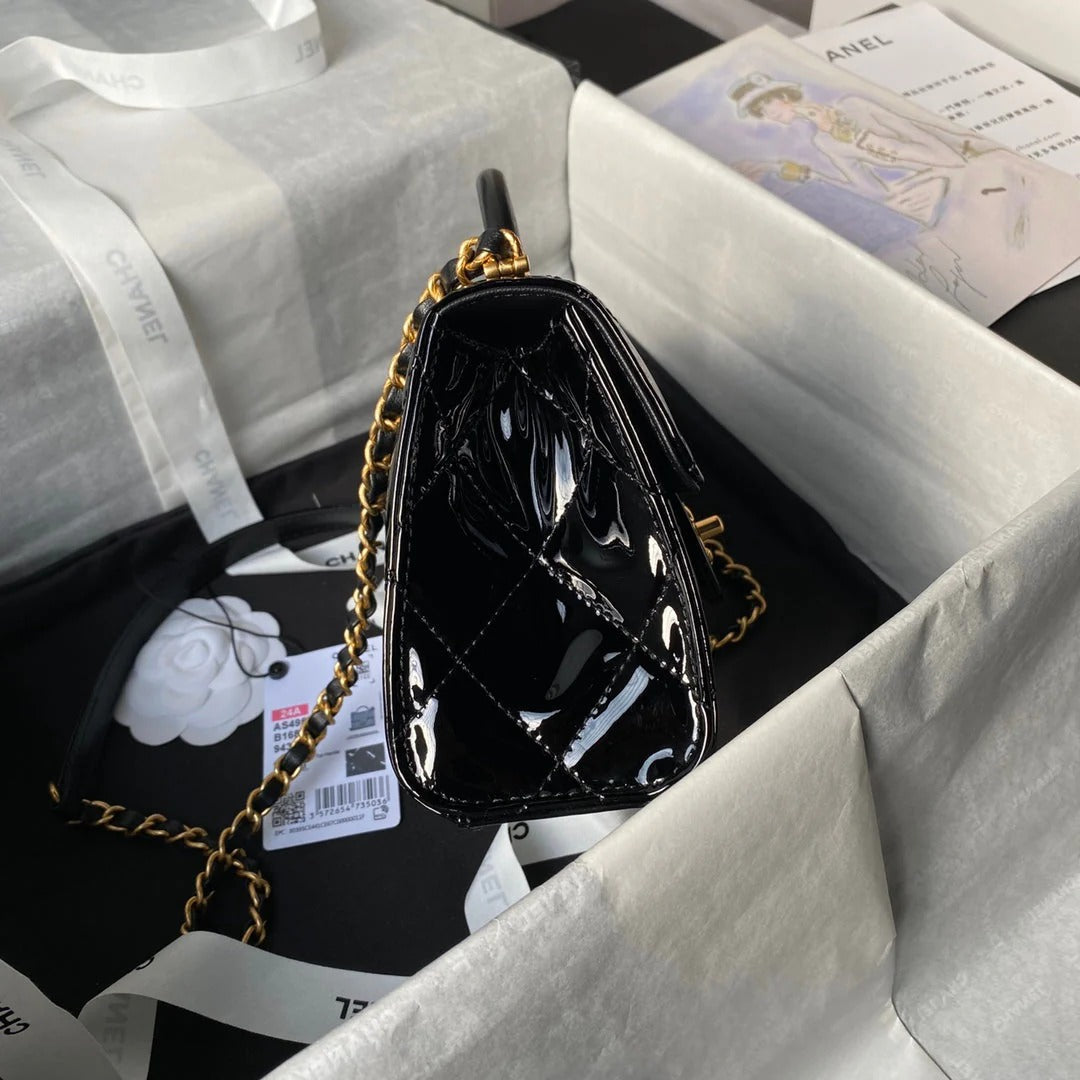 CC 25S FLAP BAG 18 CM IN BLACK PATENT LAMBSKIN WITH TOP HANDLE