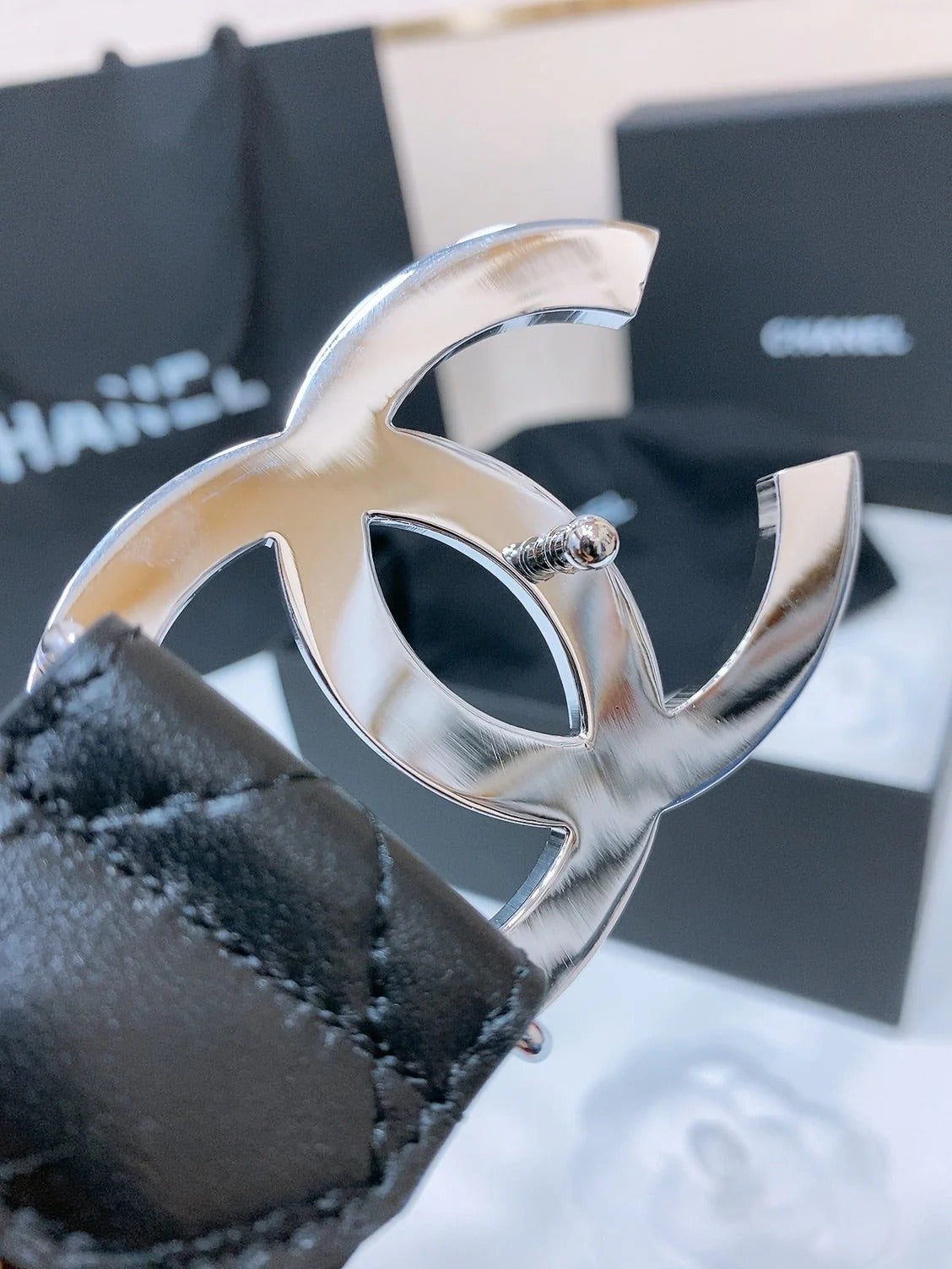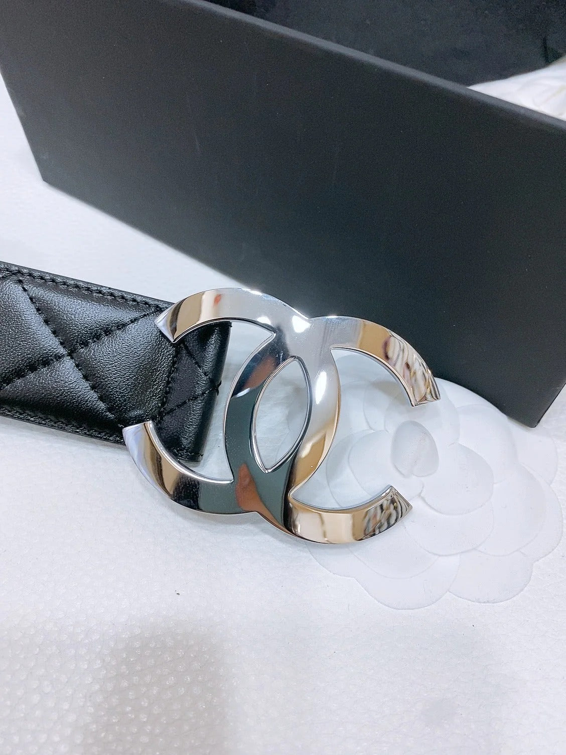 DOUBLE C 38MM IN BLACK QUILTED LAMBSKIN SILVER BUCKLE