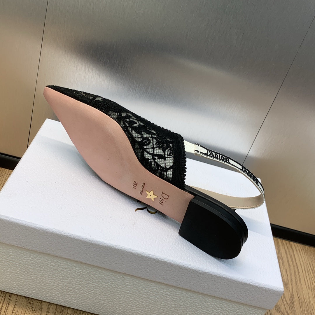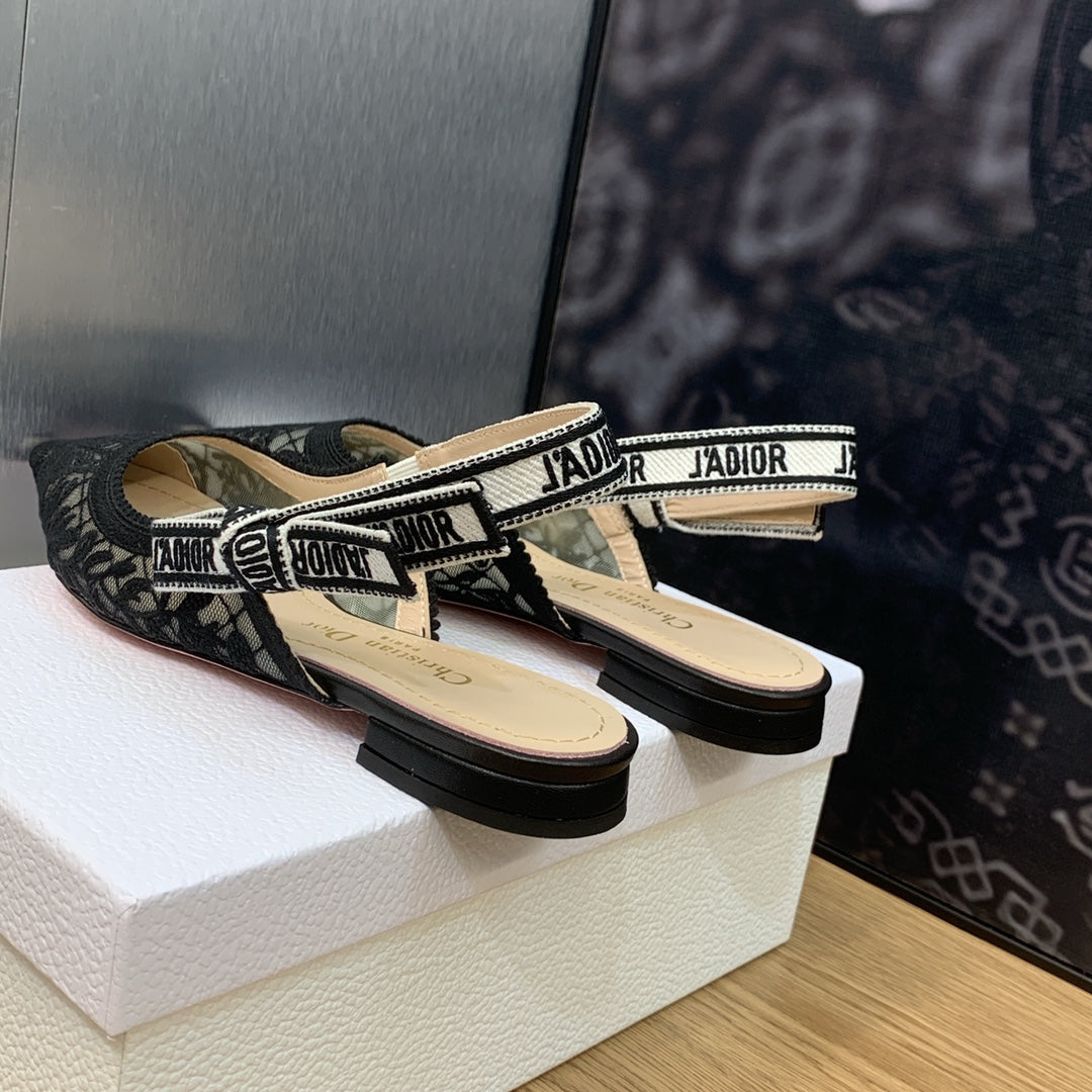 JAdior slingback flat transparent mesh embroidered black butterfly motif
