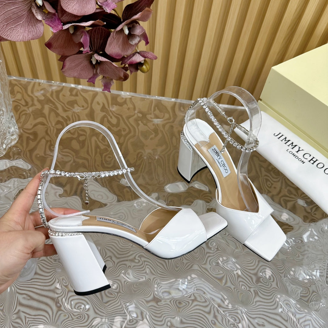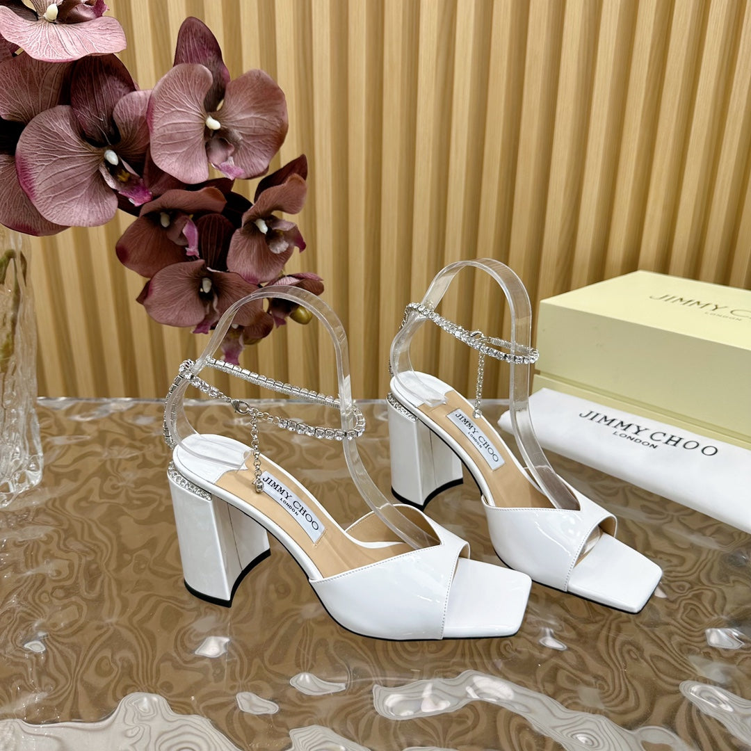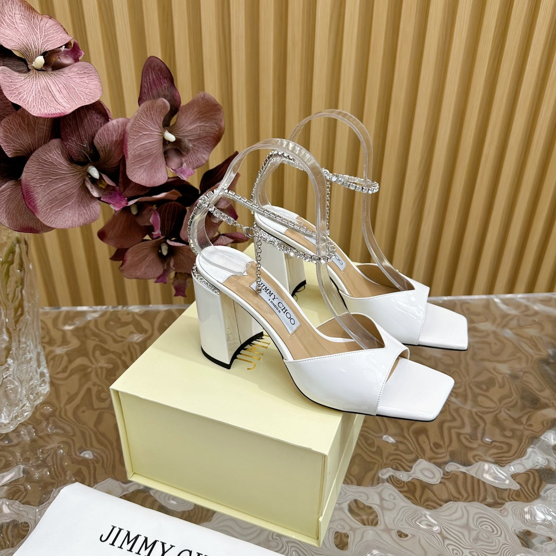 Saeda Sandal Block Heel 85 White Metallic Patent Leather Block Heel Sandals with Crystal Chain 691667