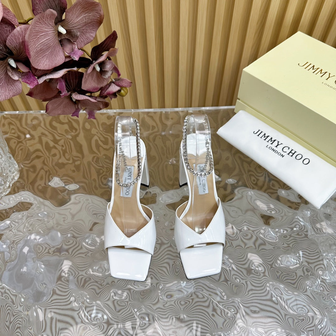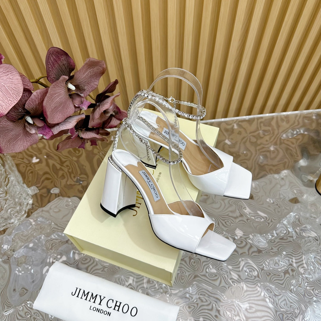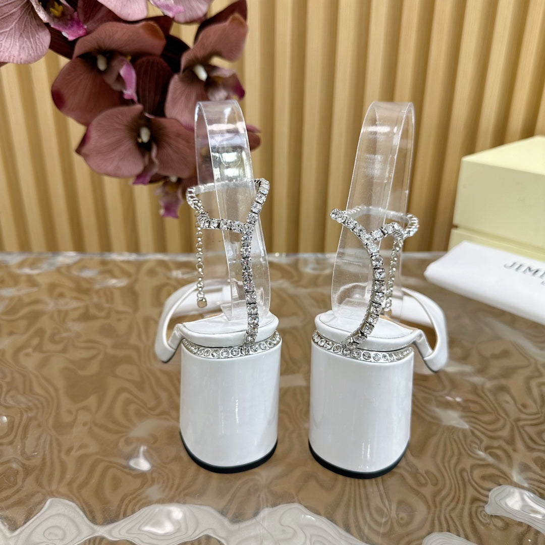 Saeda Sandal Block Heel 85 White Metallic Patent Leather Block Heel Sandals with Crystal Chain 691667