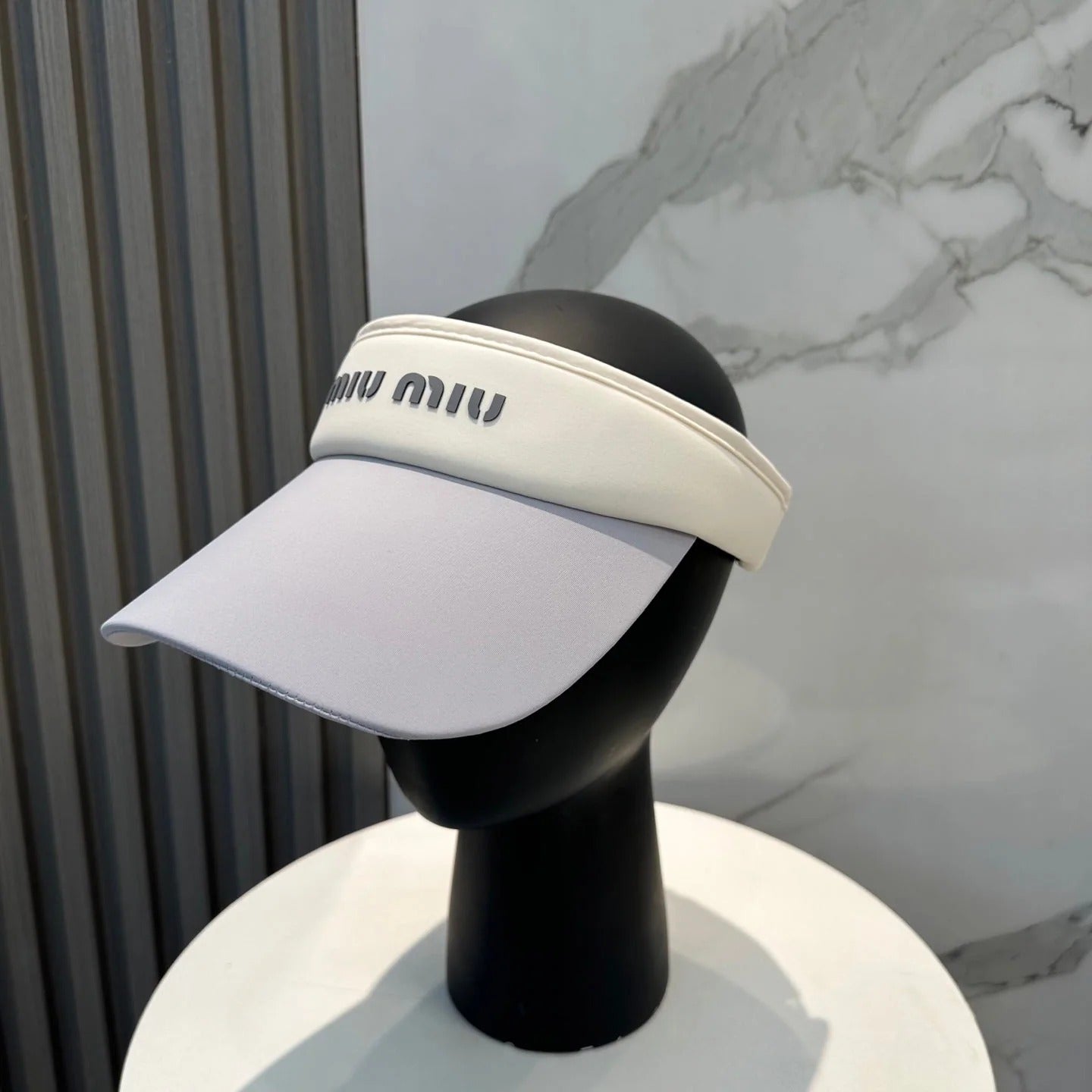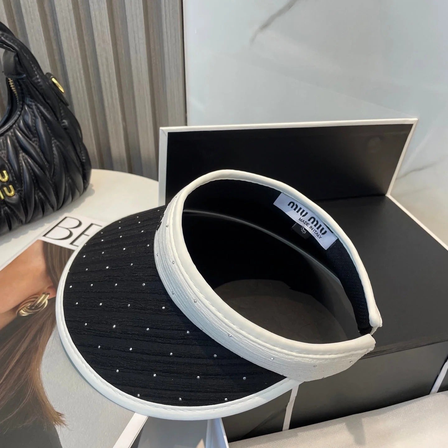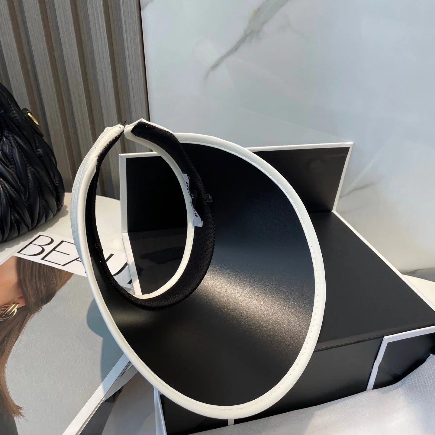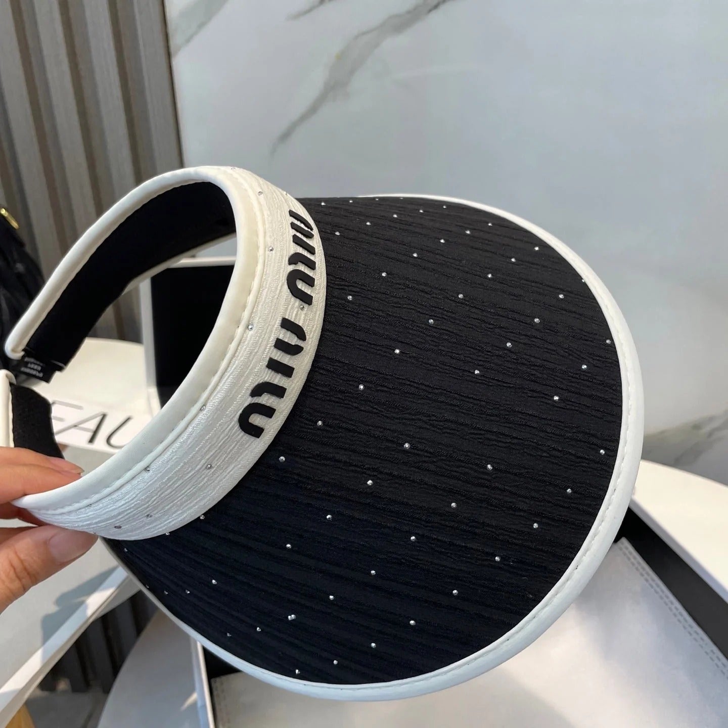 MM FASHION VISOR CAP IN BLACK AND WHITE WITH LOGO TEXT EMBROIDERY