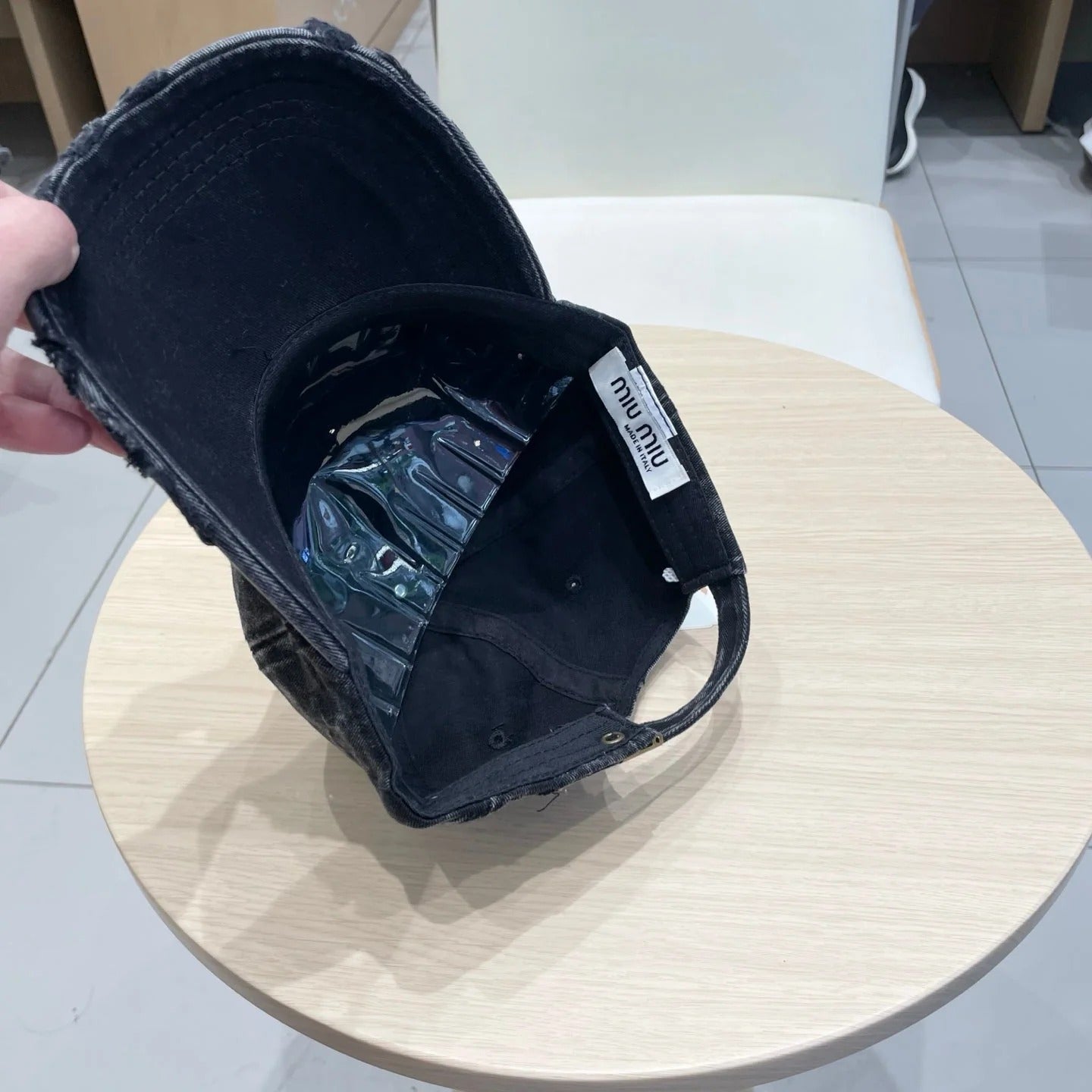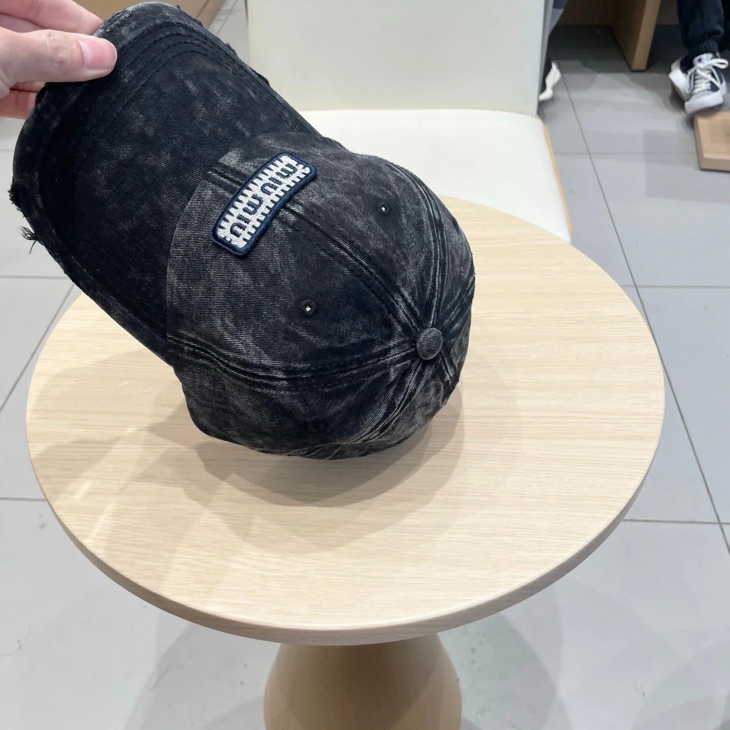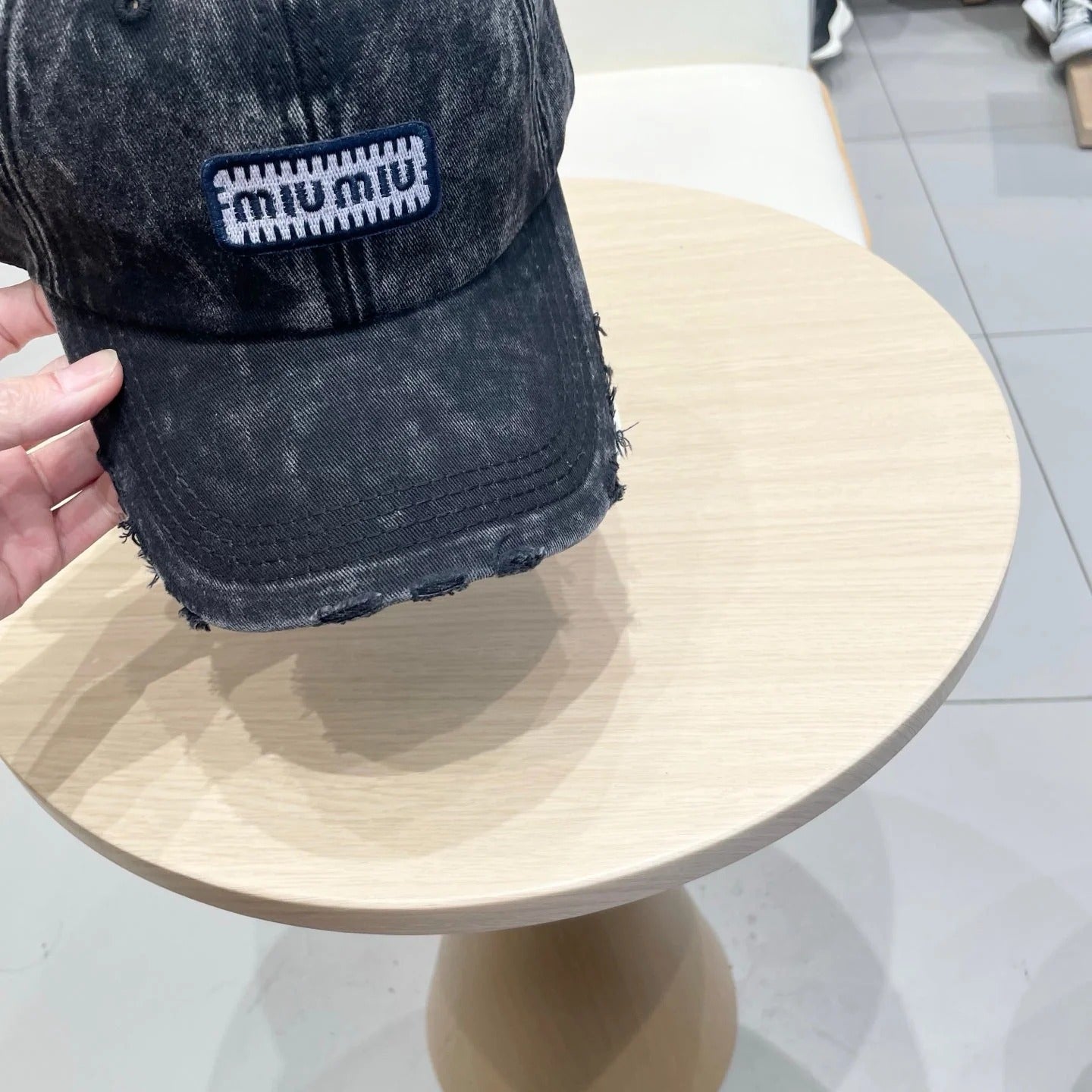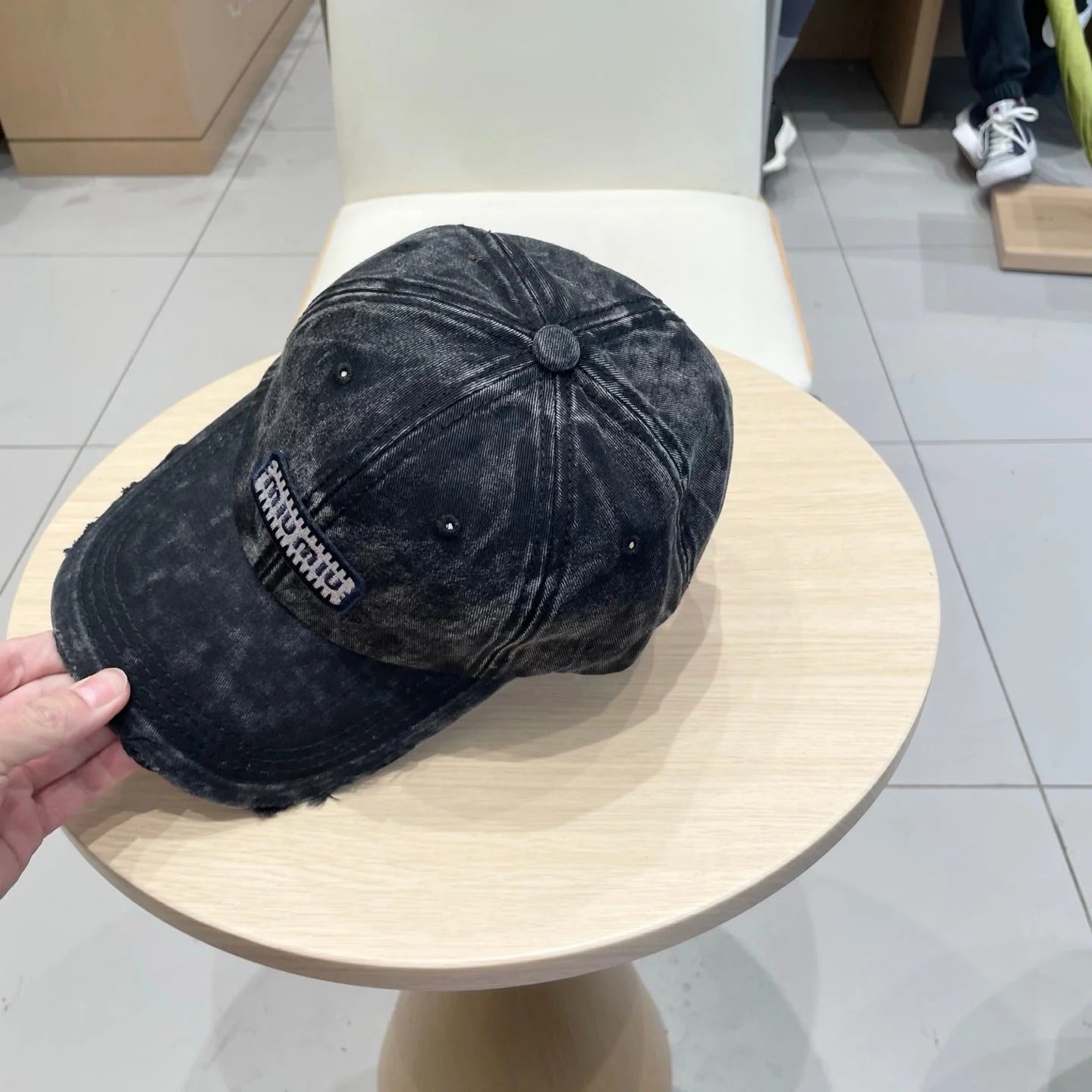 MM DISTRESSED FABRIC BASEBALL CAP IN BLACK WITH EMBROIDERED LOGO