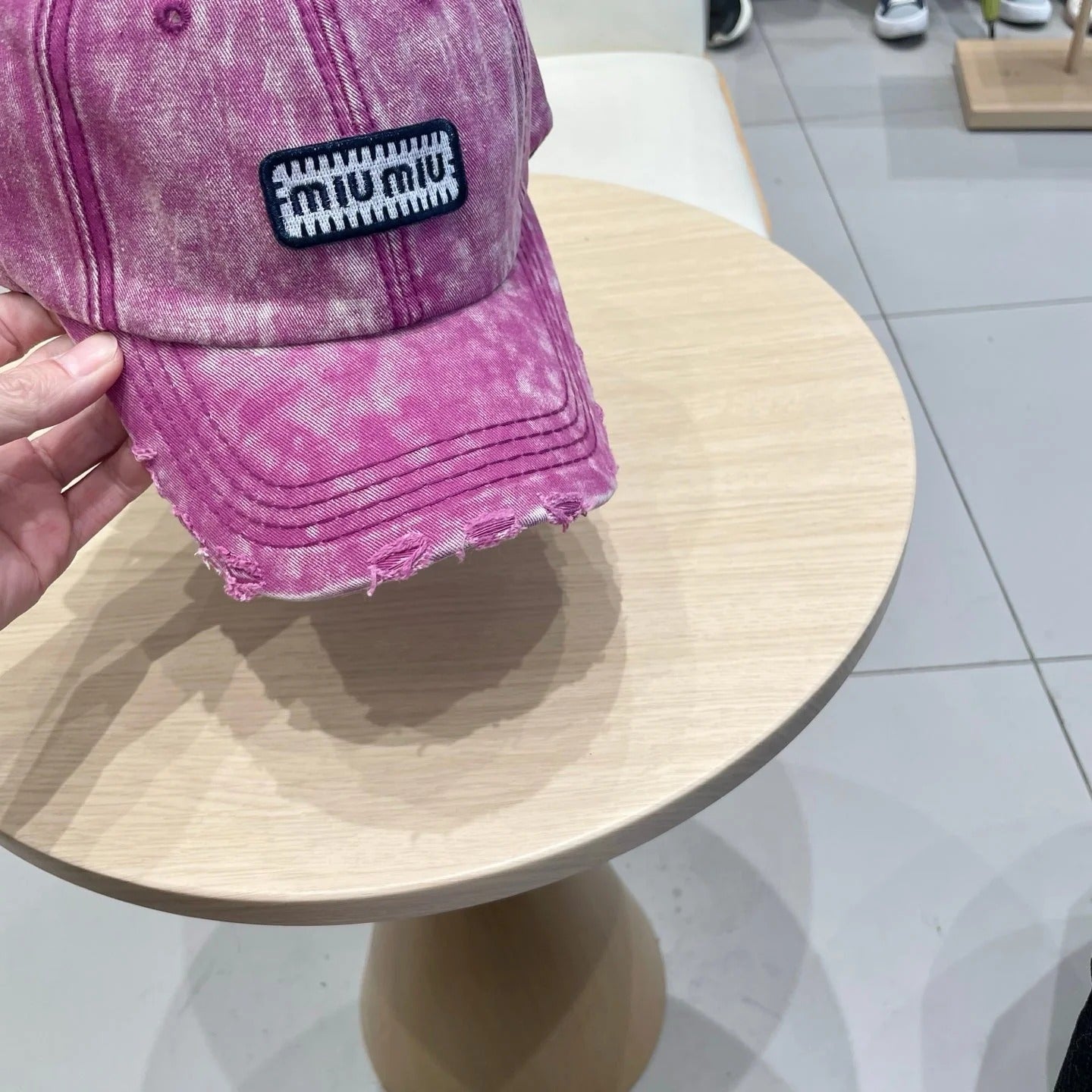 MM DISTRESSED FABRIC BASEBALL CAP IN PINK WITH EMBROIDERED LOGO