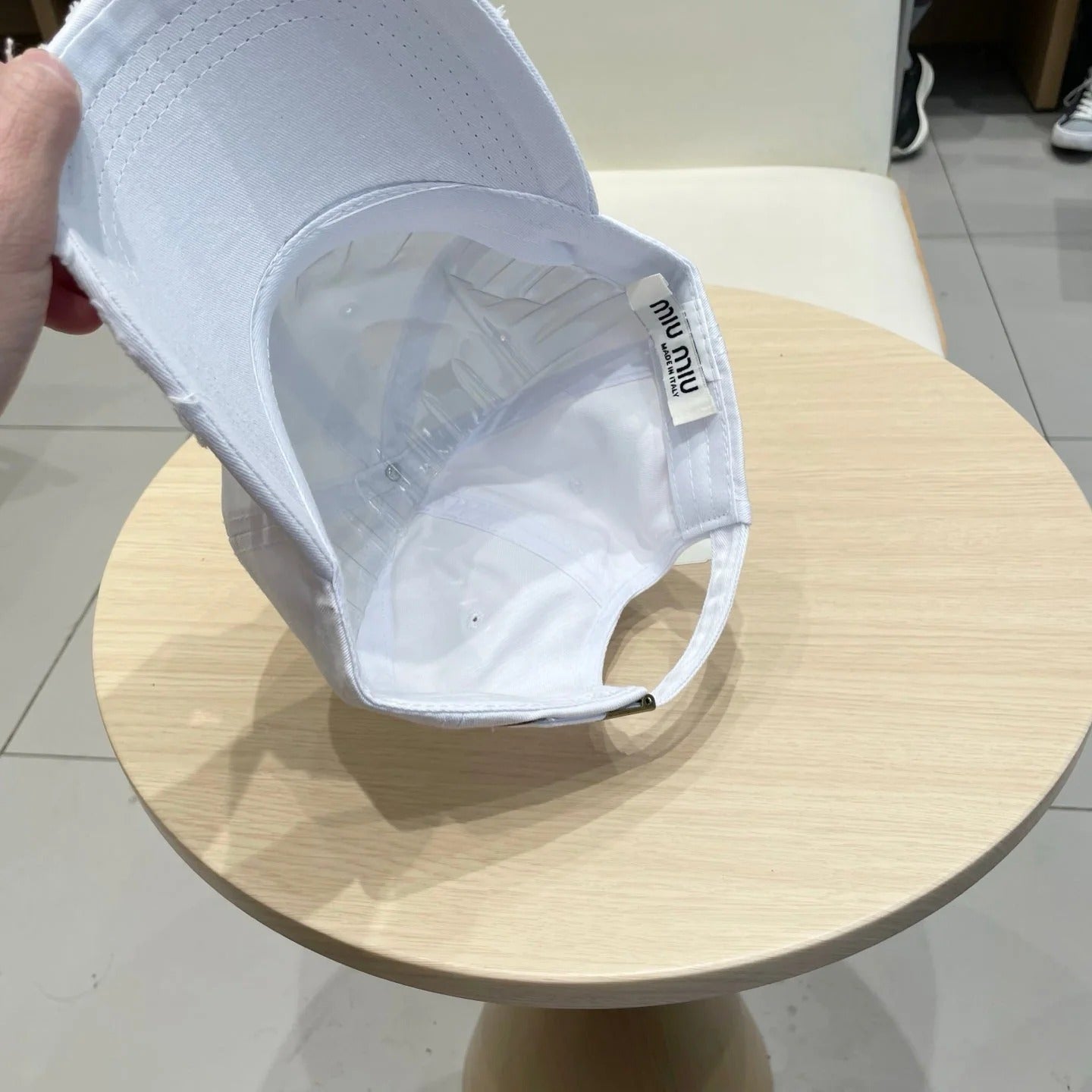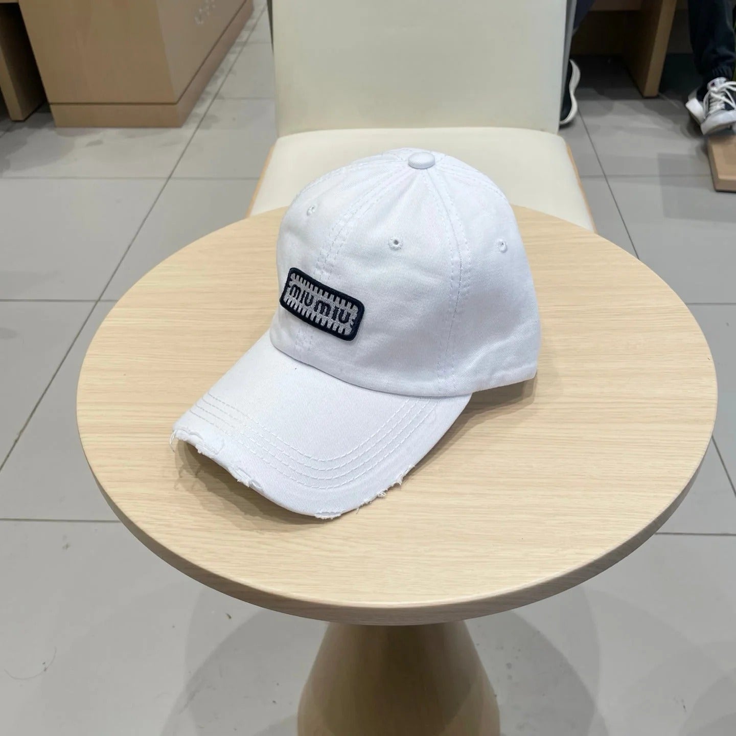 MM DISTRESSED FABRIC BASEBALL CAP IN WHITE WITH EMBROIDERED LOGO