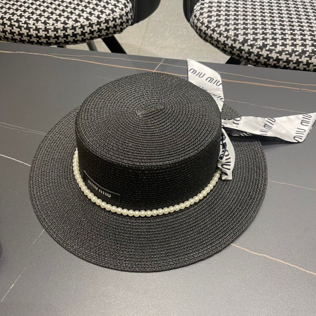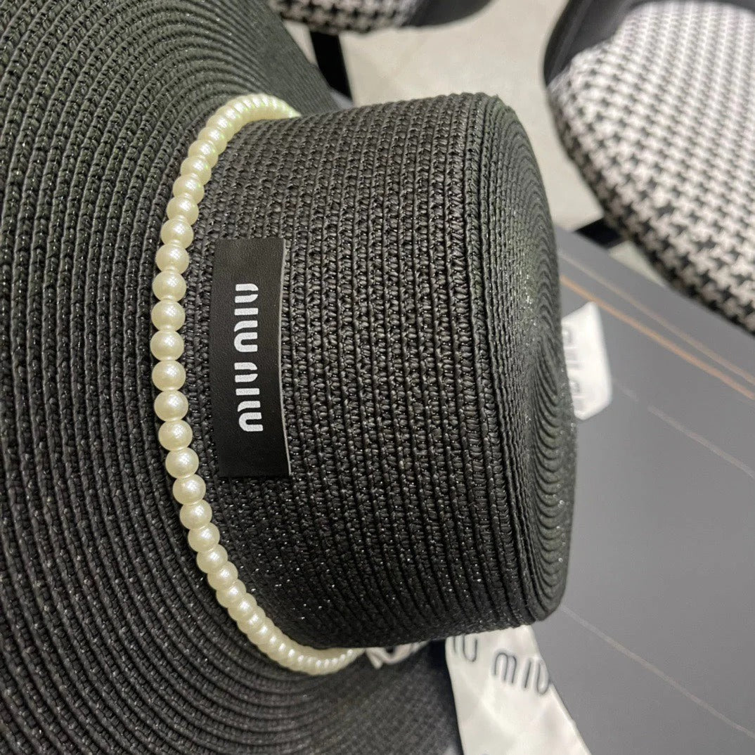 MM SMALL-BRIM STRAW HAT IN BLACK AND PEARL EMBELLISHED