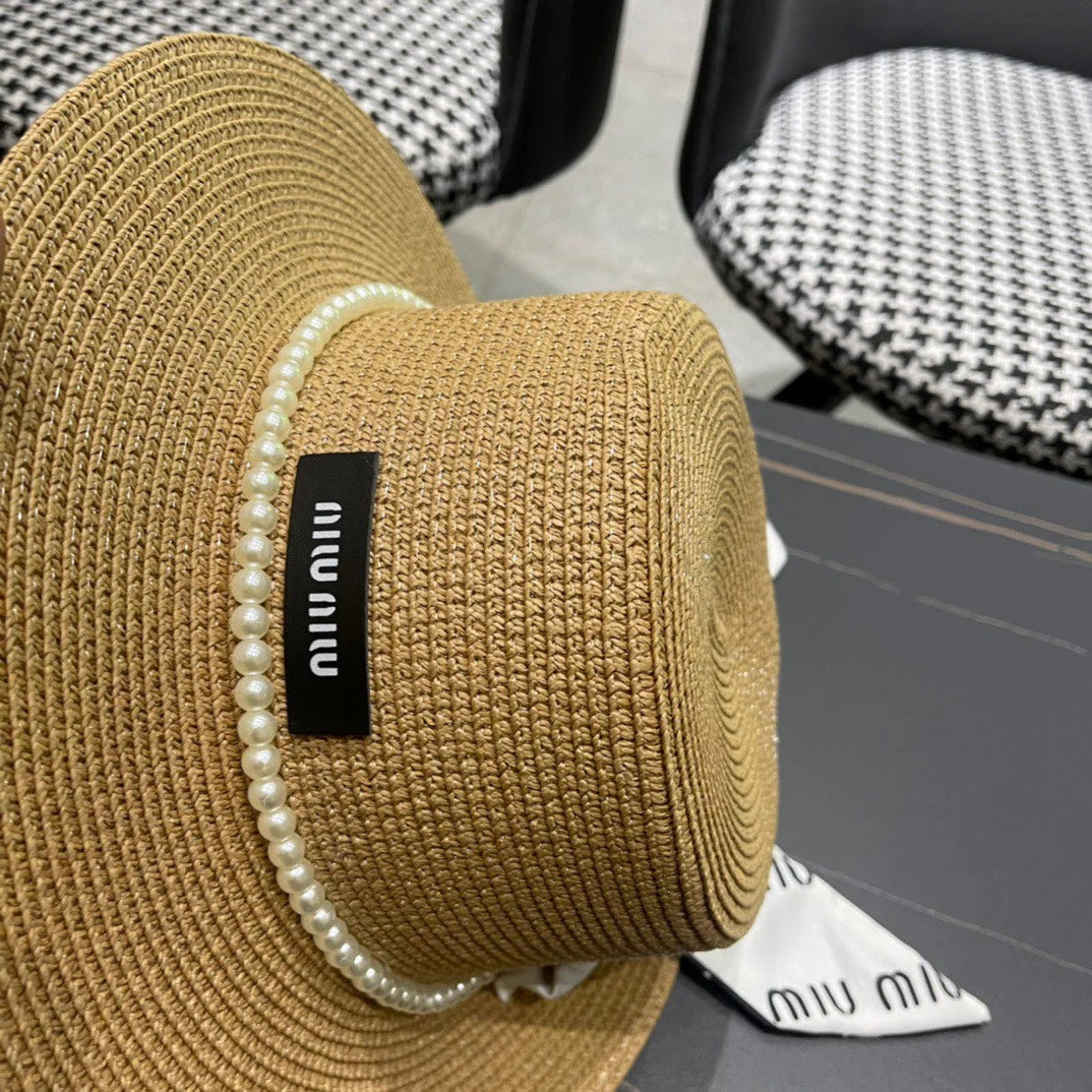 MM SMALL-BRIM STRAW HAT IN LIGHT BEIGE AND PEARL EMBELLISHED