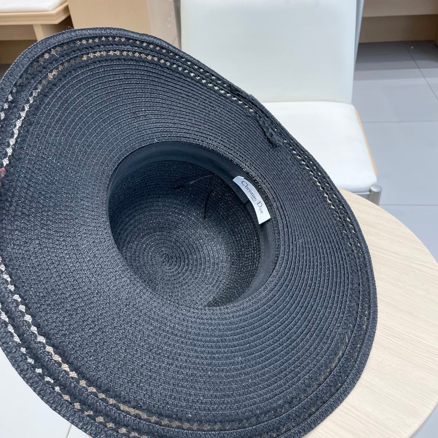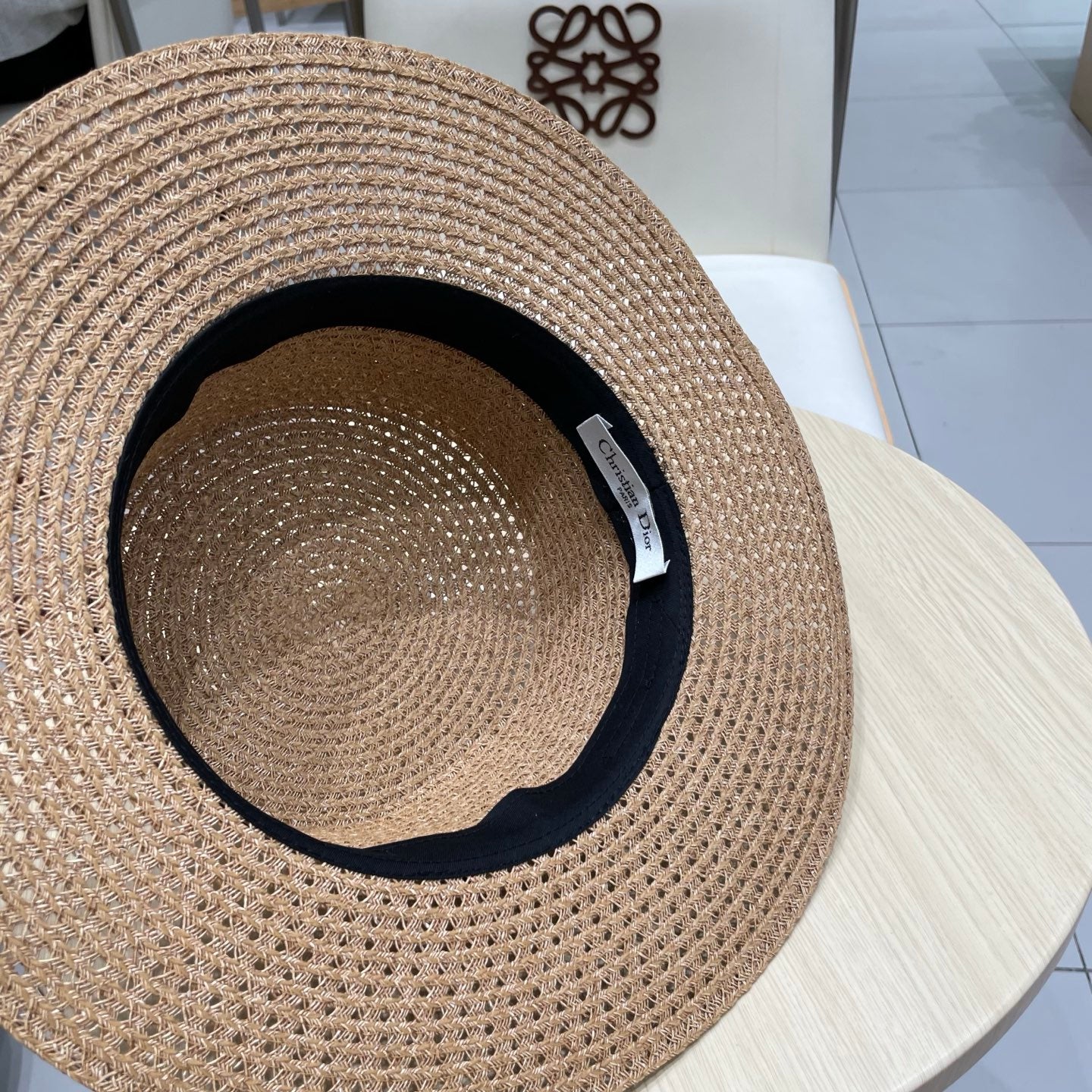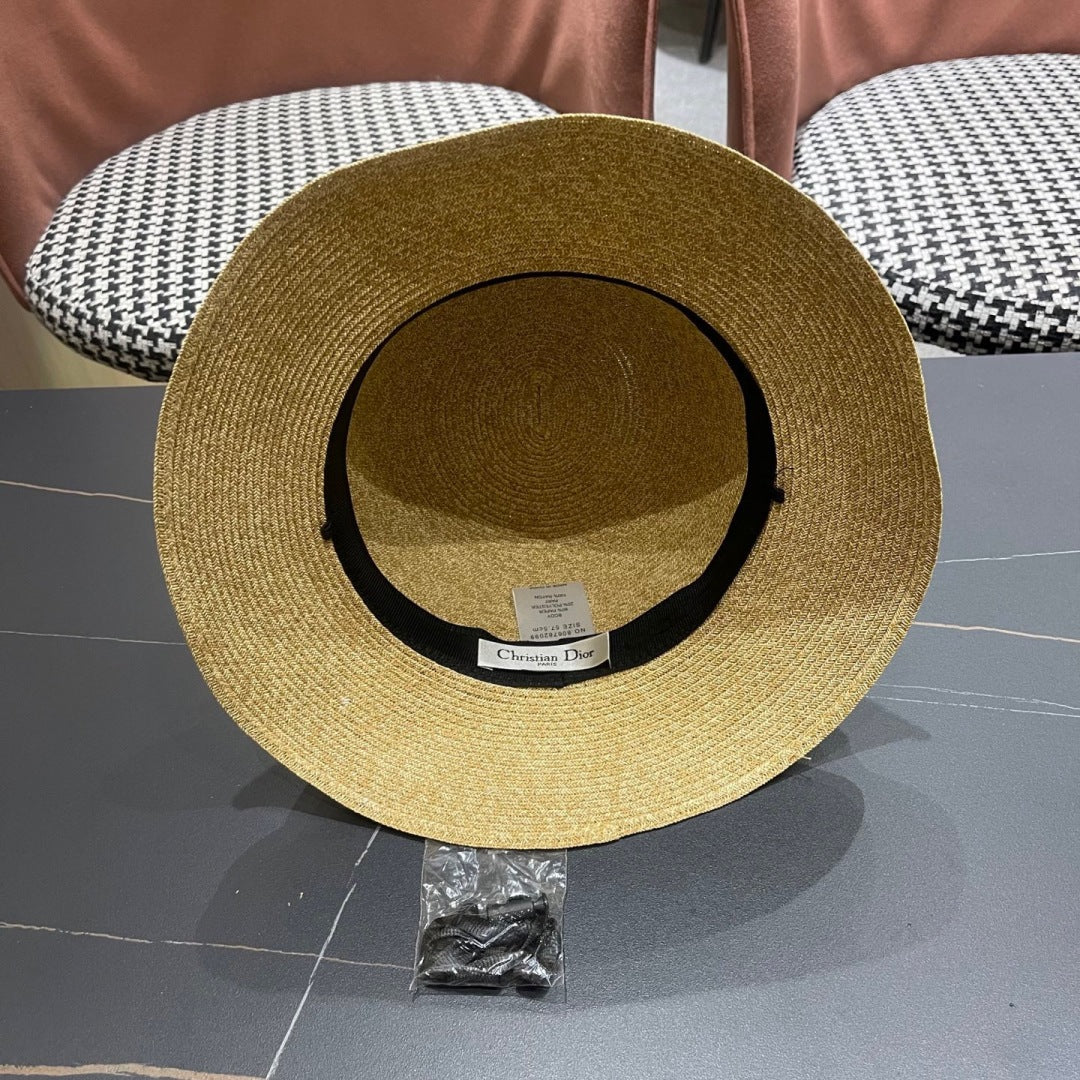 BOATER HAT IN BEIGE RAFFIA WITH BLACK FABRIC