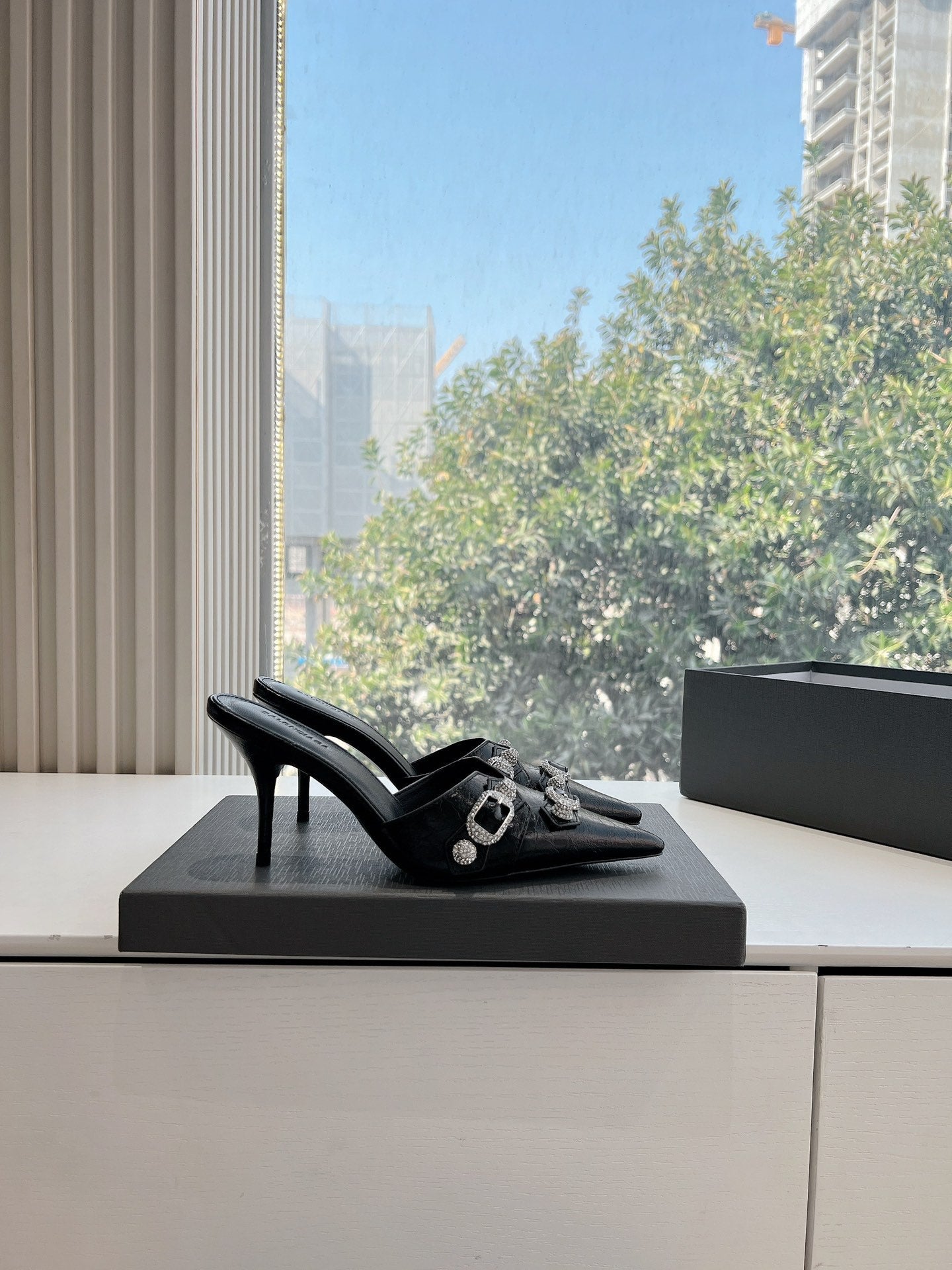 CRYSTAL BUCKLE BLACK WAX-OIL SHEEPSKIN HEELED MULES