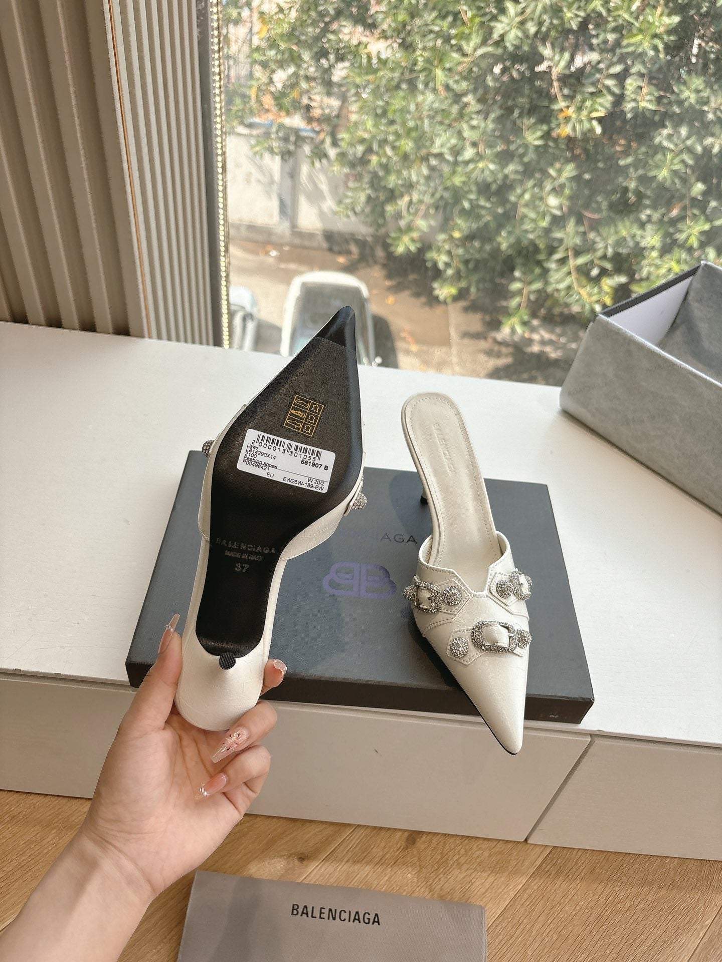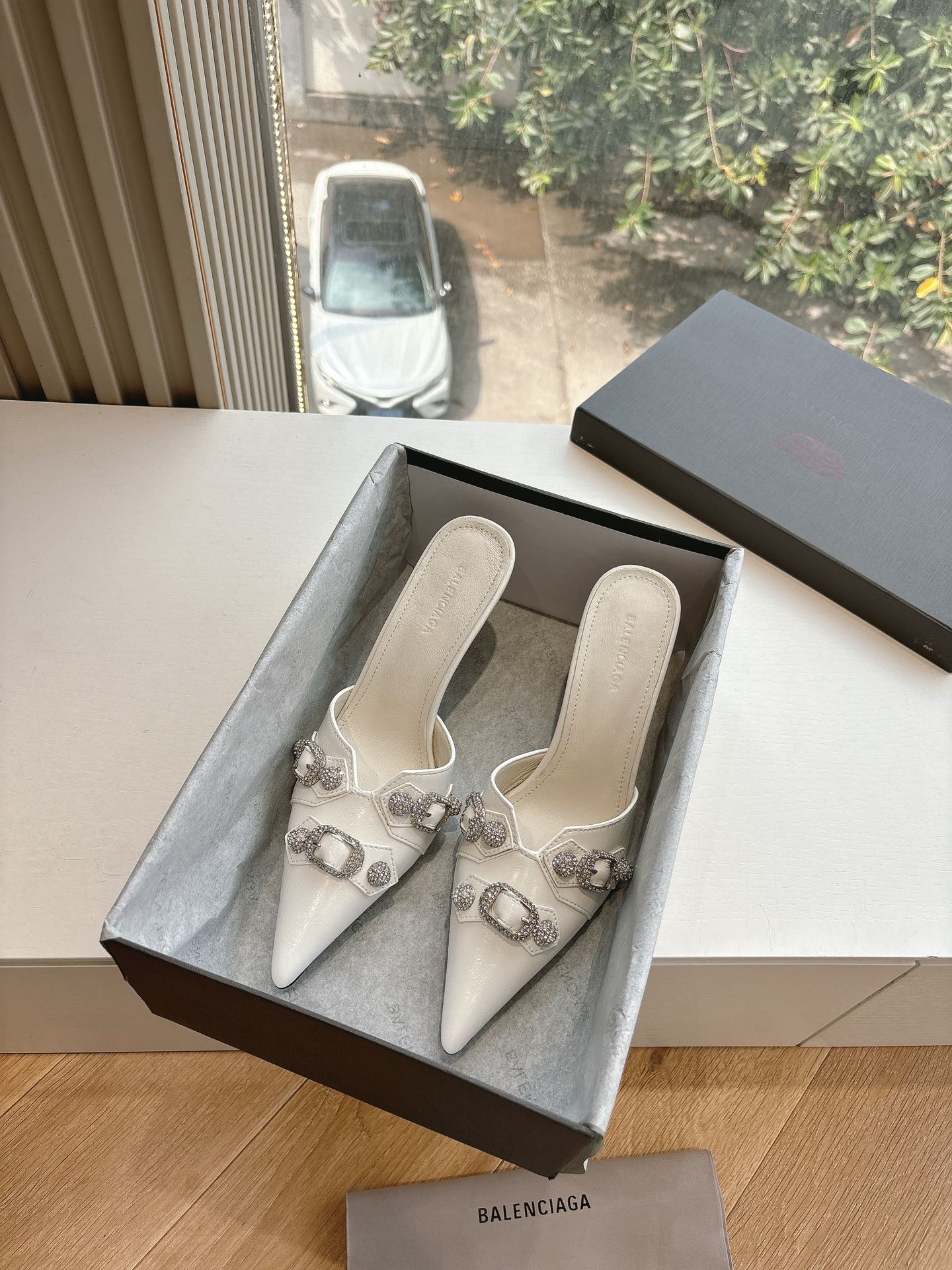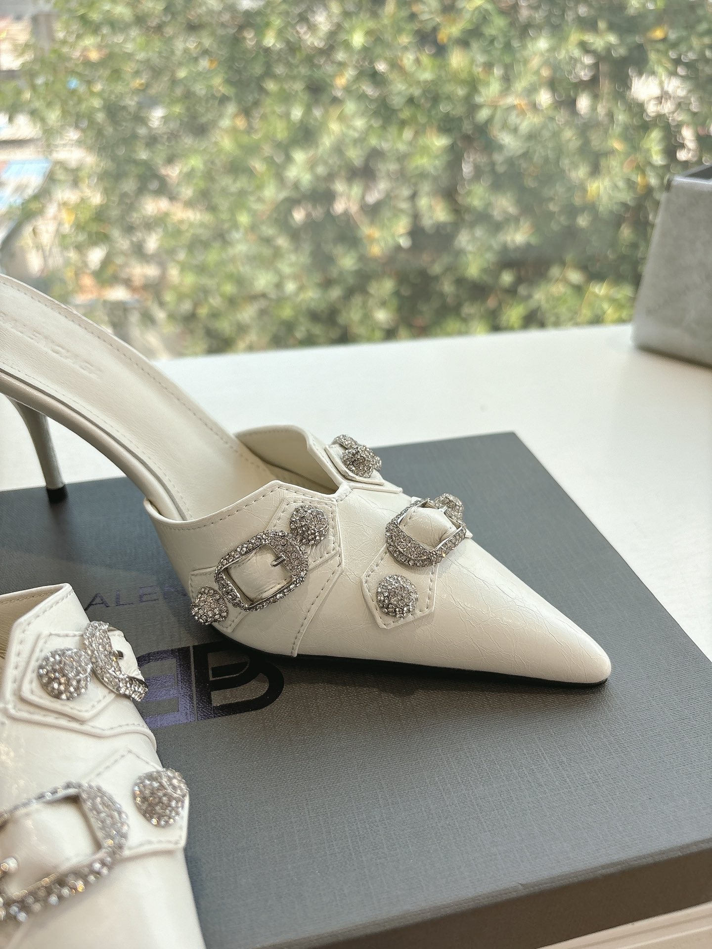 CRYSTAL BUCKLE WHITE CALFSKIN HEELED MULES