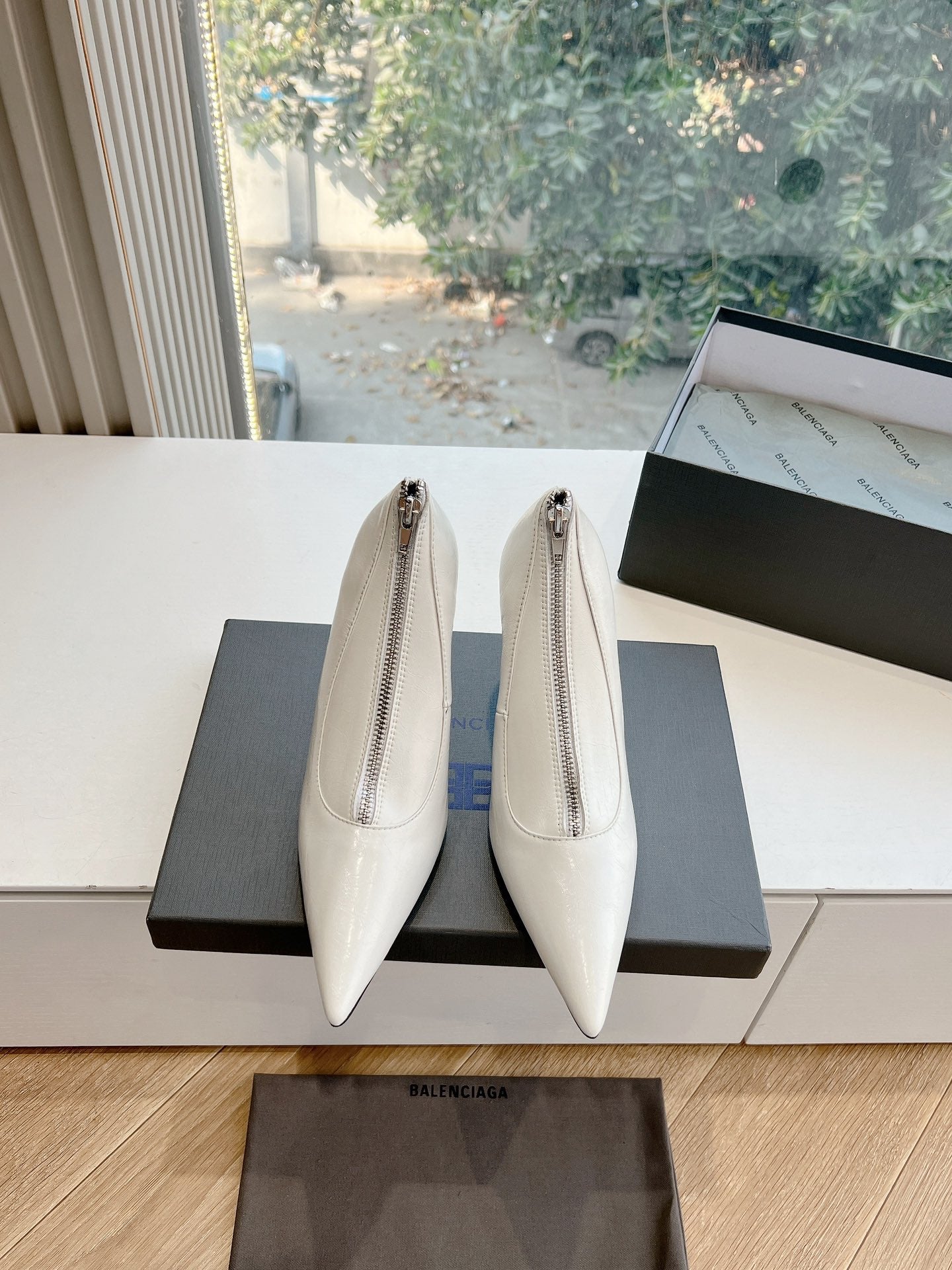 ZIPPER POINTED-TOE HIGH PUMPS IN WHITE WAX-OIL SHEEPSKIN