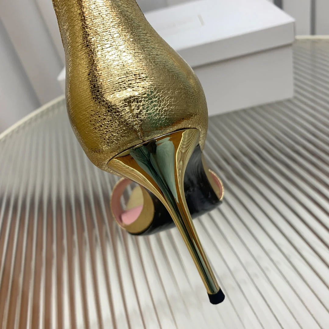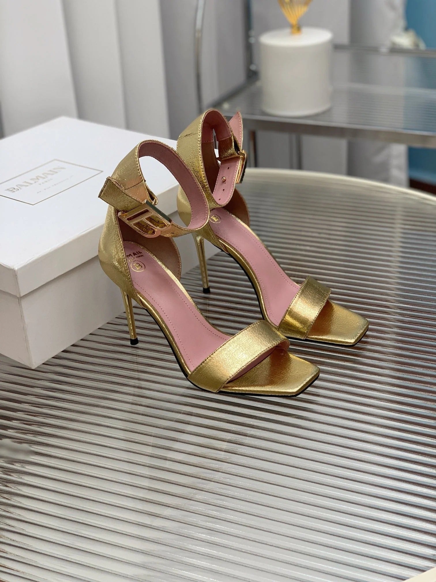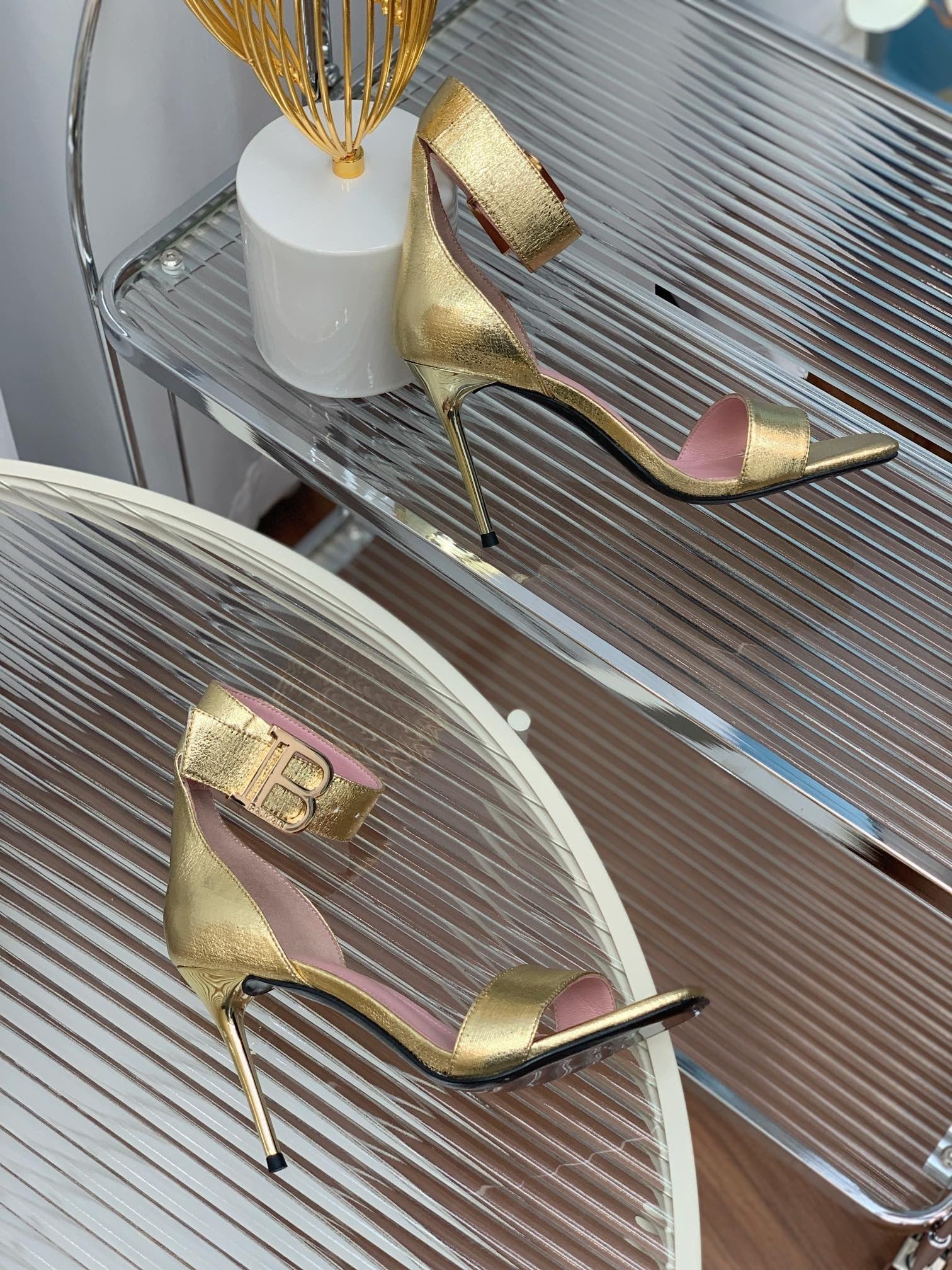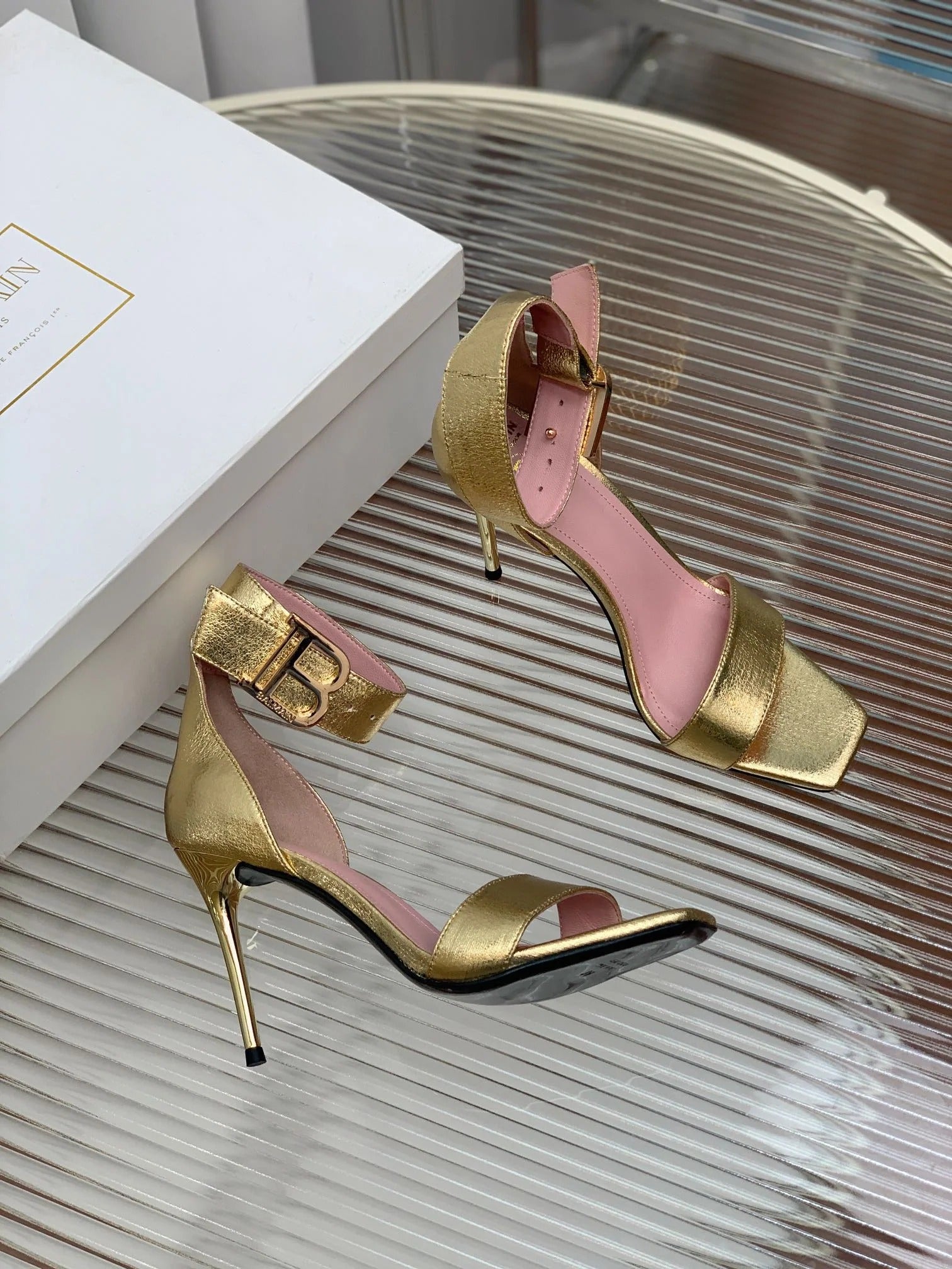 BALMAIN 25S B STRAP HIGH HEEL SANDALS 95MM IN GOLD CALFSKIN