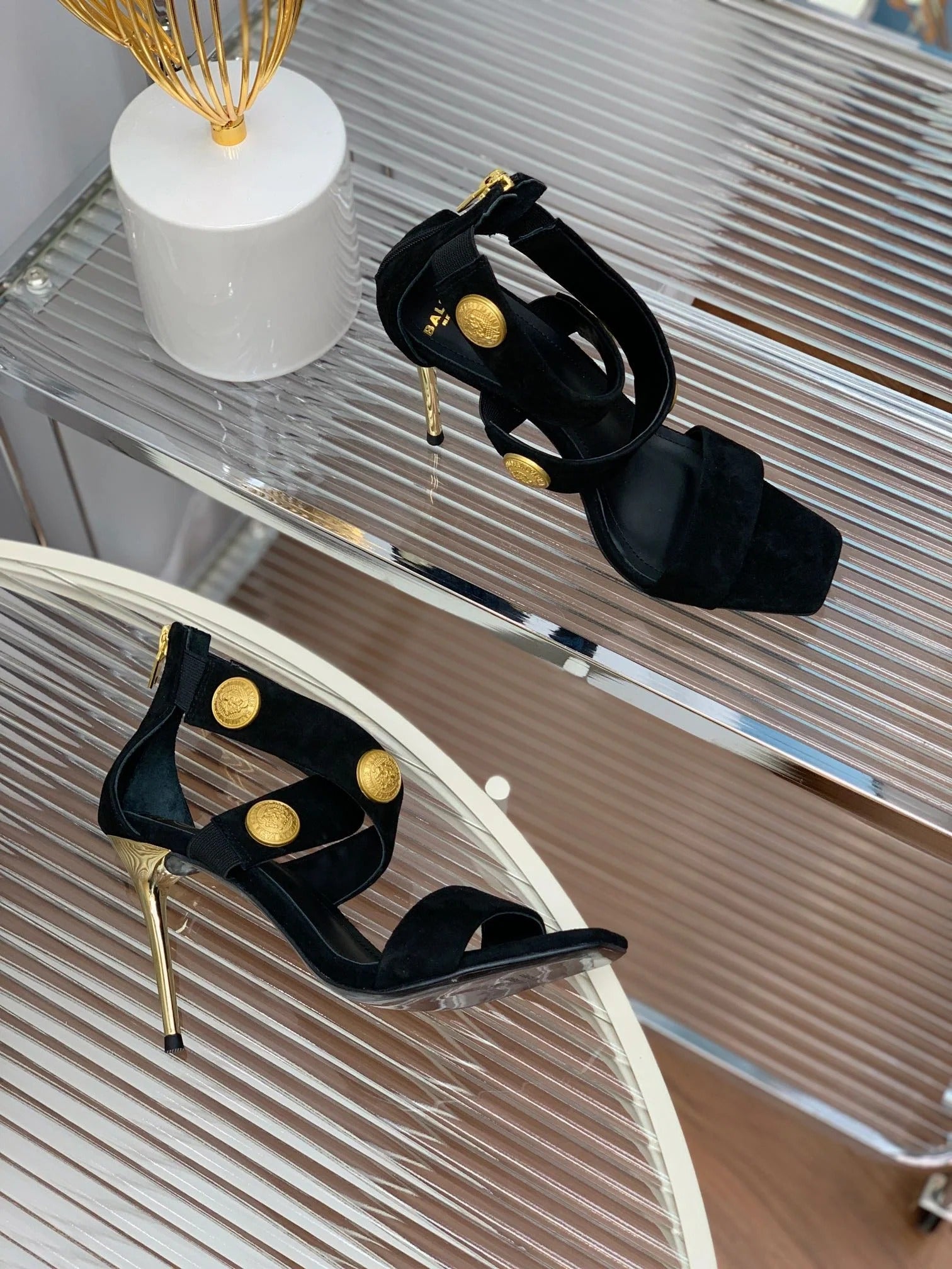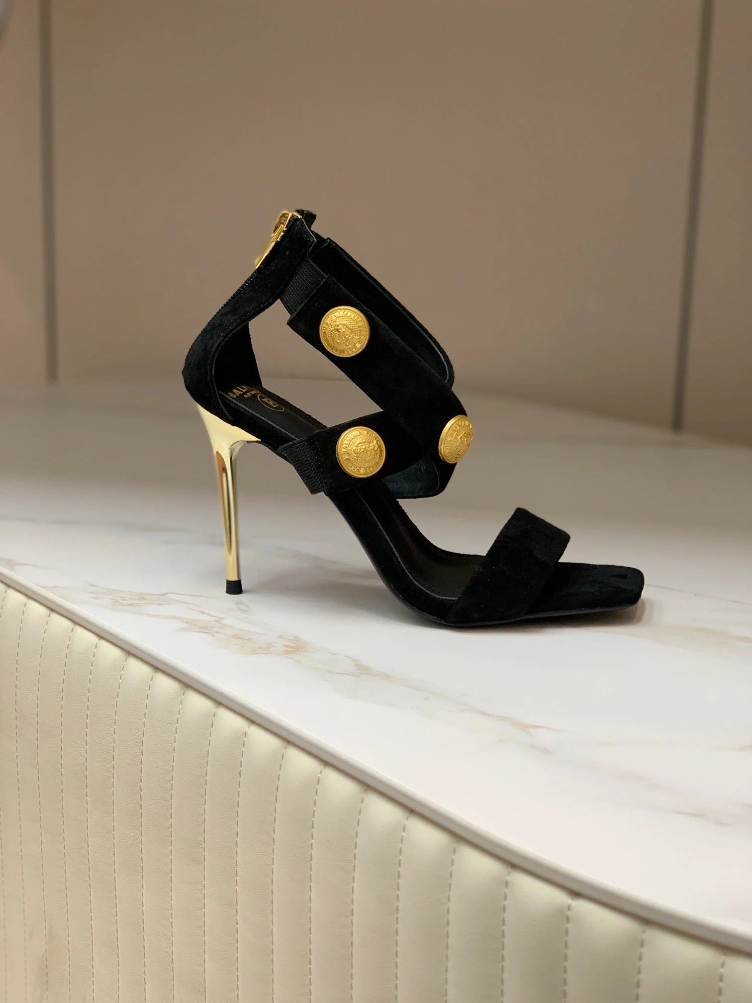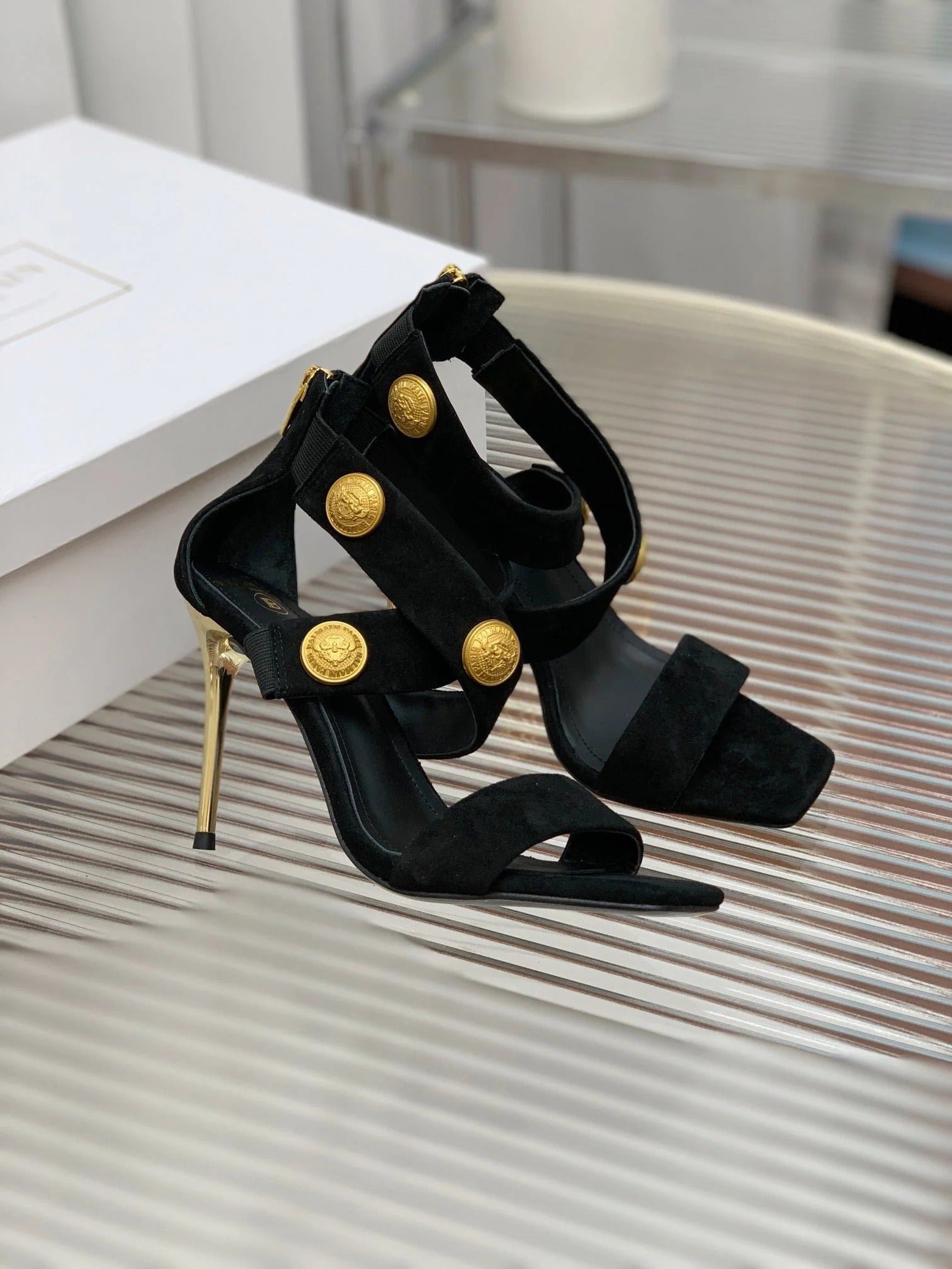 BALMAIN 25S CROSSOVER STRAP HIGH HEELS 95MM IN BLACK SUEDE