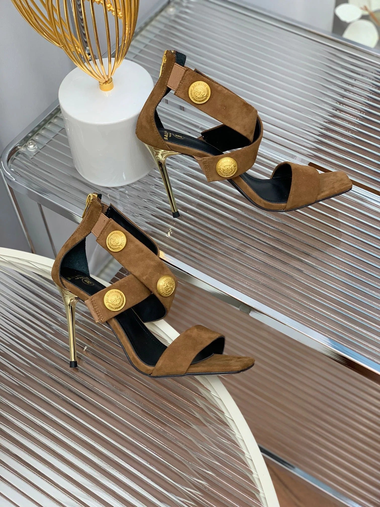 BALMAIN 25S CROSSOVER STRAP HIGH HEELS 95MM IN BROWN SUEDE
