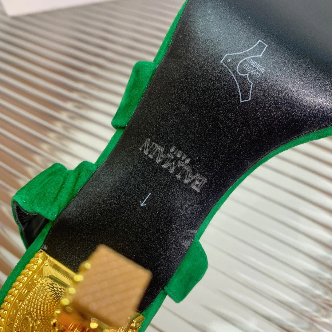 BALMAIN 25S HIGH HEEL SANDALS 95MM IN DARK GREEN SUEDE
