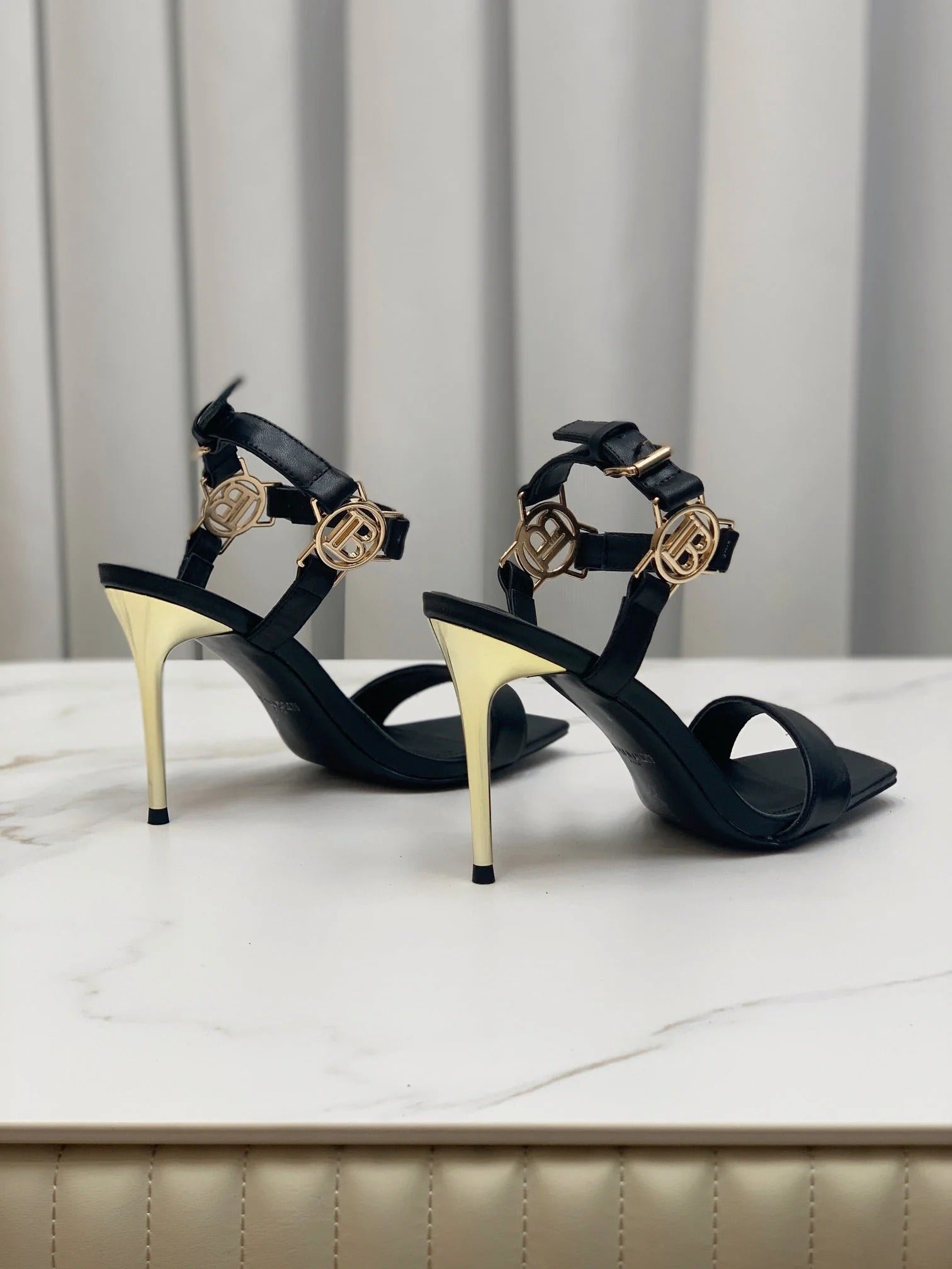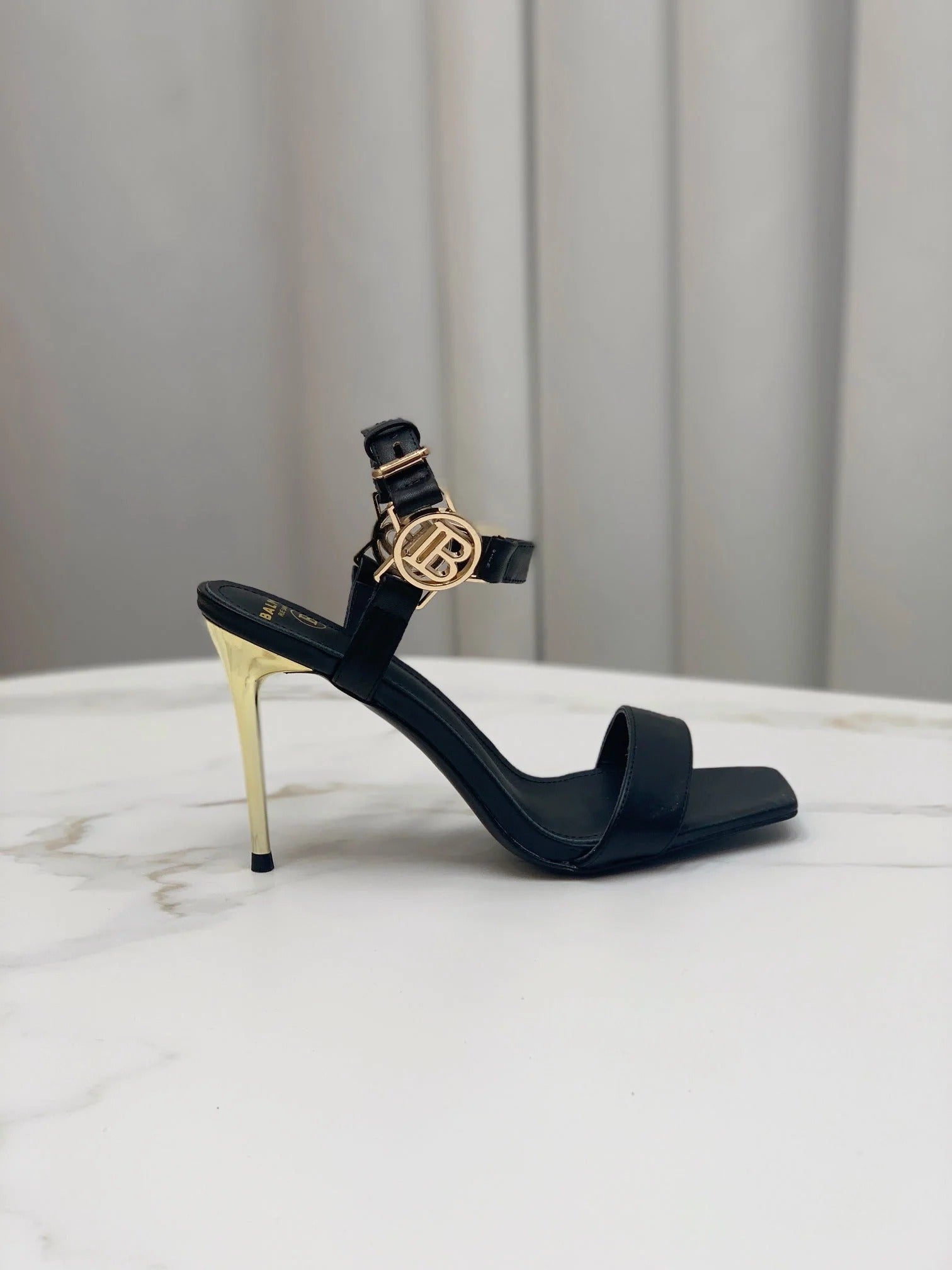 BALMAIN 25S HIGH HEELS WITH B METAL DETAIL 95MM IN BLACK CALFSKIN