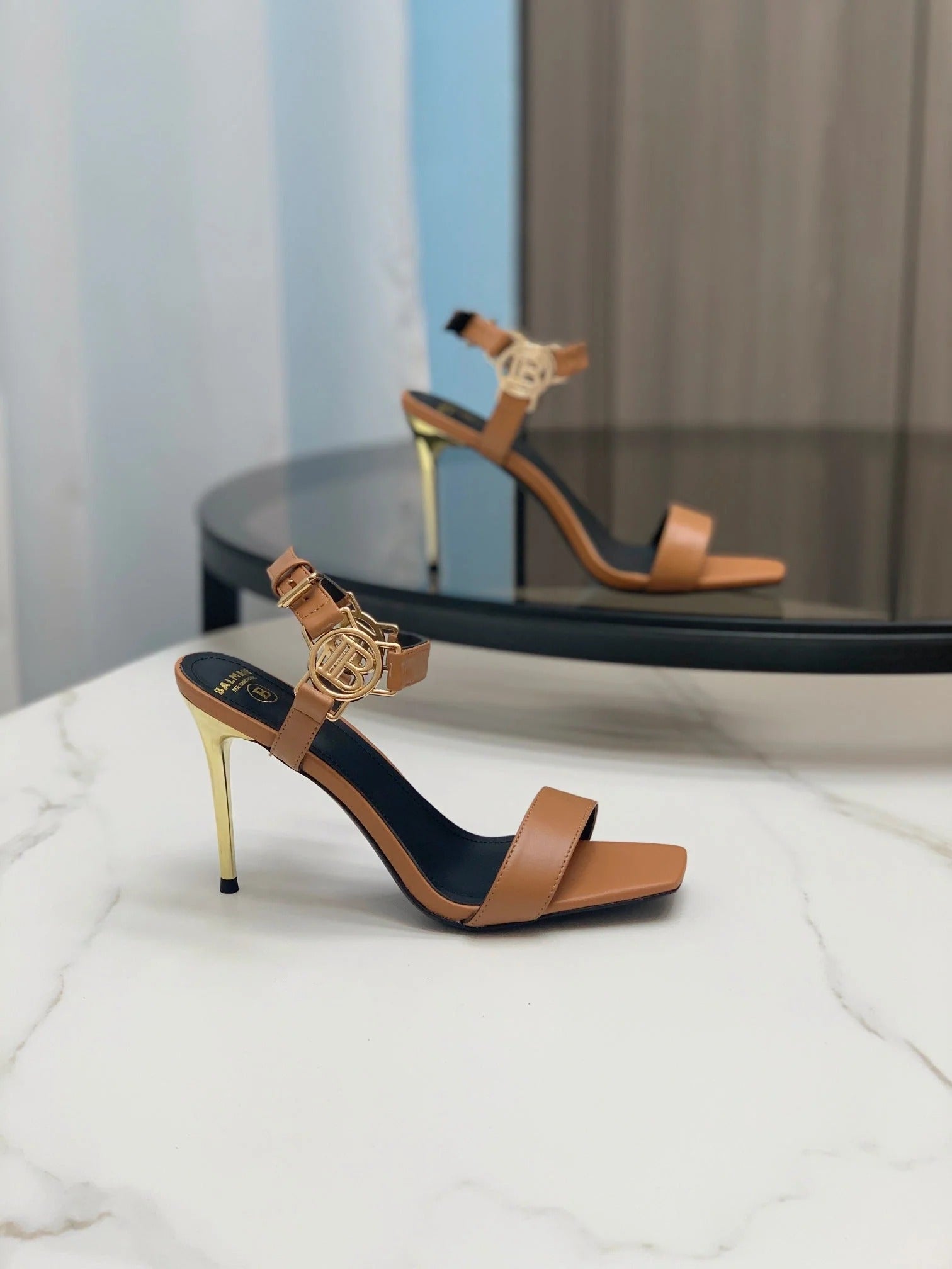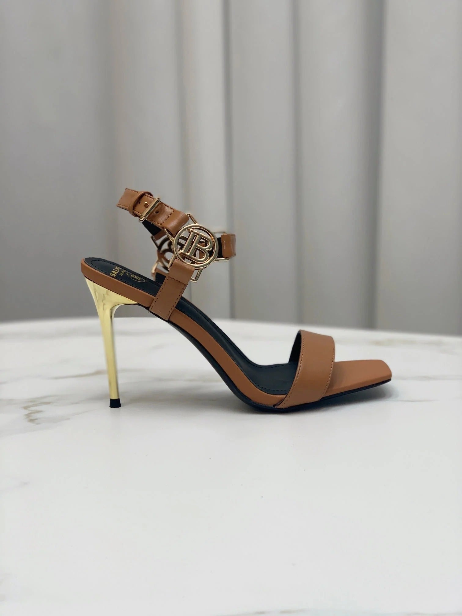 BALMAIN 25S HIGH HEELS WITH B METAL DETAIL 95MM IN CARAMEL CALFSKIN