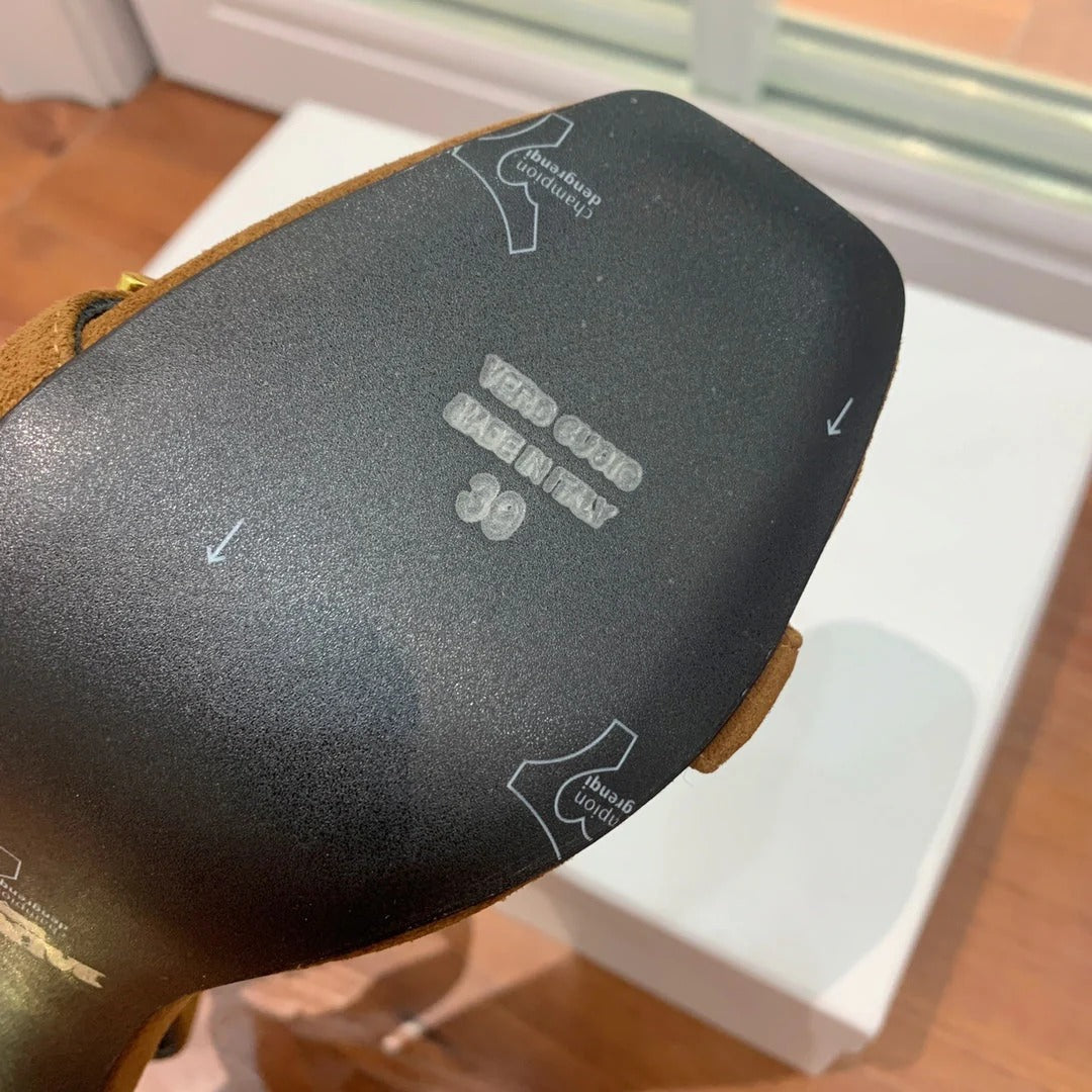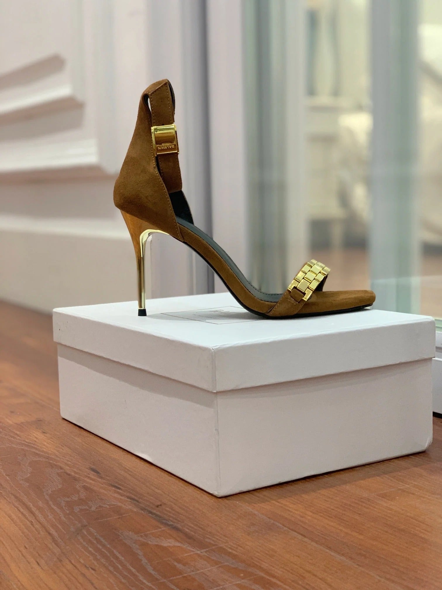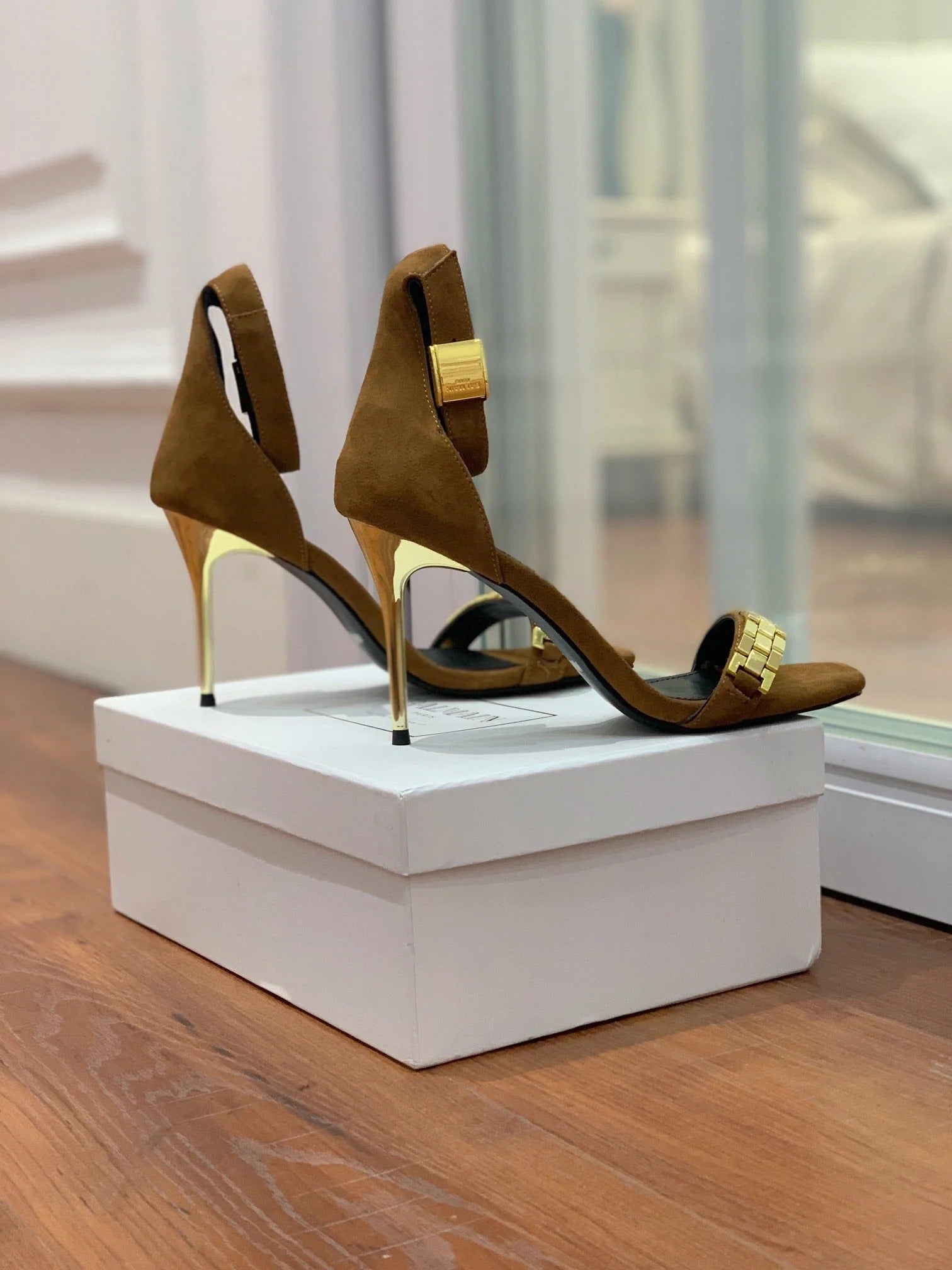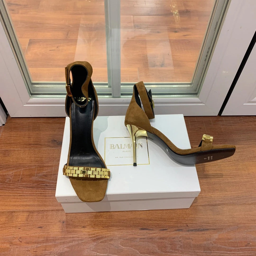 BALMAIN 25S METAL STRAP HIGH HEELS 95MM IN BROWN SUEDE GOLD HARDWARE