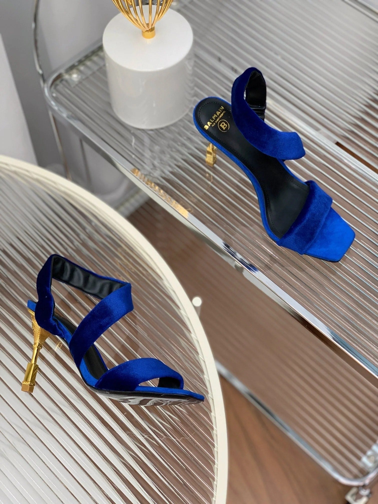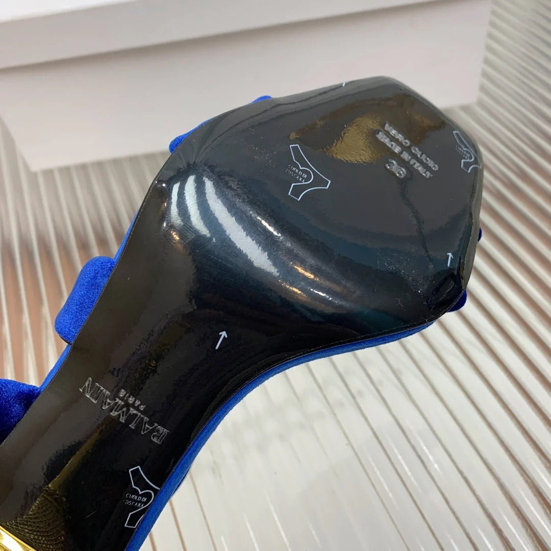 BALMAIN 25S MONETA HEELED SANDALS 95MM IN DARK BLUE VELVET