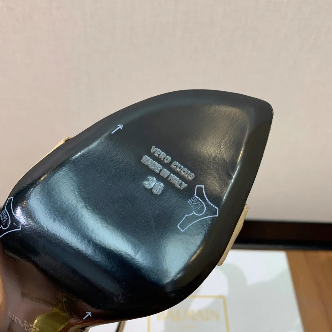 BALMAIN 25S SQUARE STRAP HIGH HEELS 100MM IN BEIGE GRAY CALFSKIN