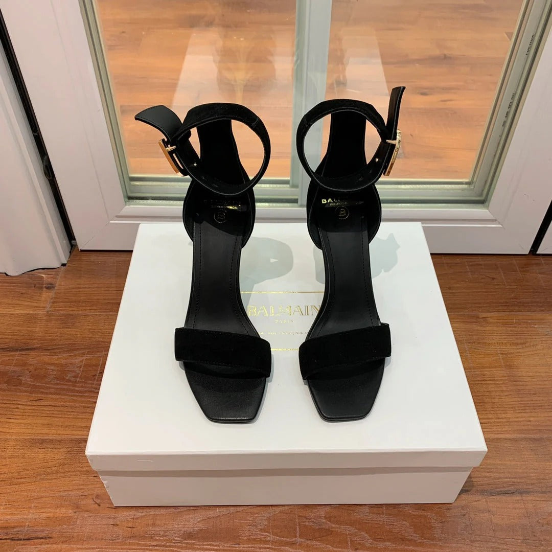 BALMAIN 25S THIN STRAP HIGH HEELS 105MM IN BLACK SUEDE GOLD HARDWARE