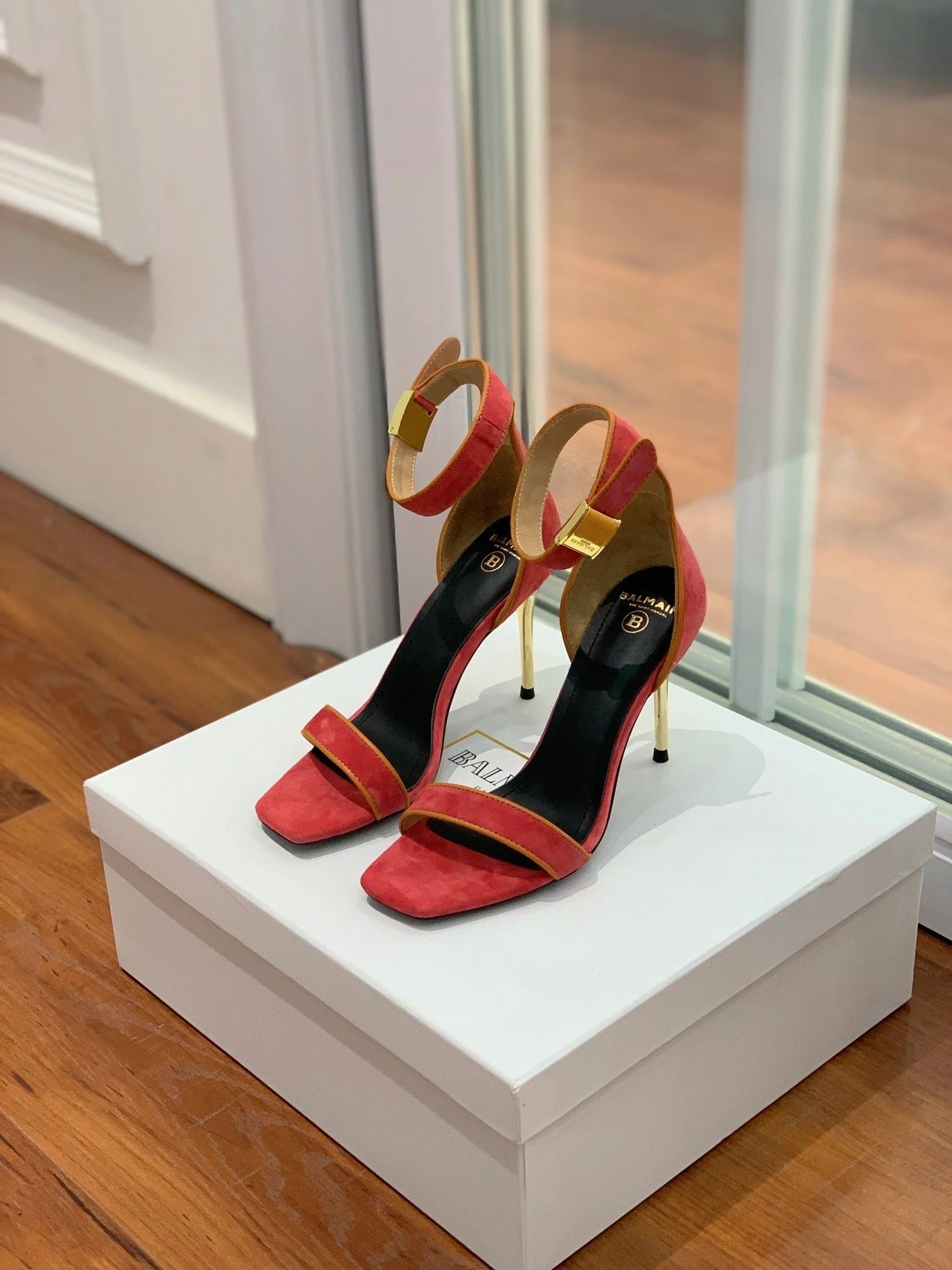 BALMAIN 25S UMA HEELED SANDALS 105MM IN RED SUEDE GOLD HARDWARE