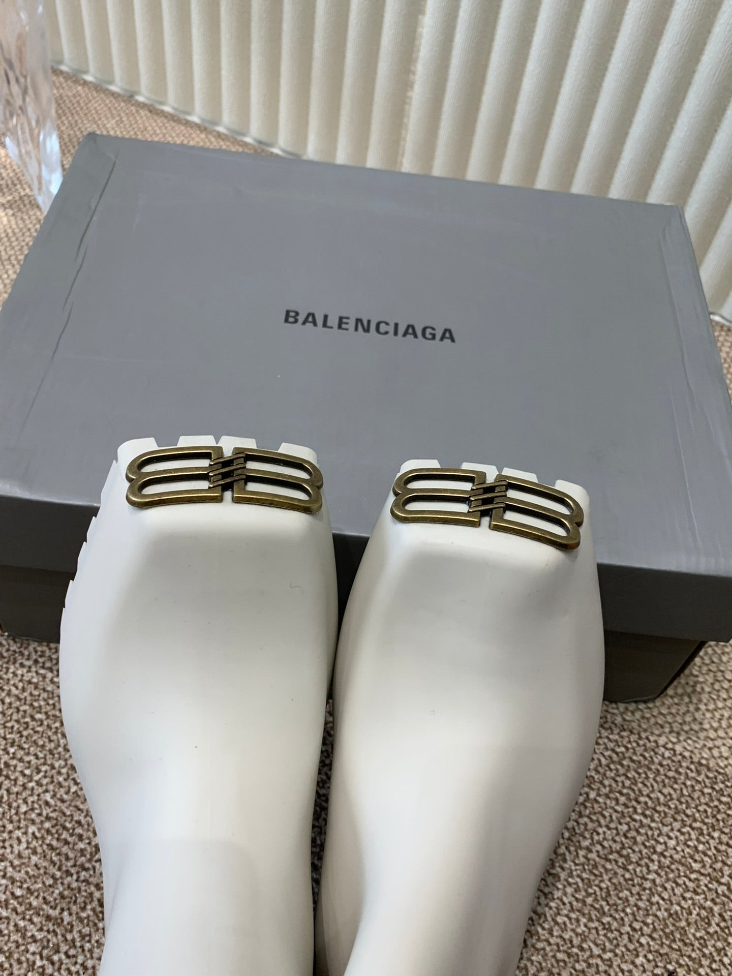 WHITE SCULPTED RUBBER BOOTS WITH GOLD MONOGRAM