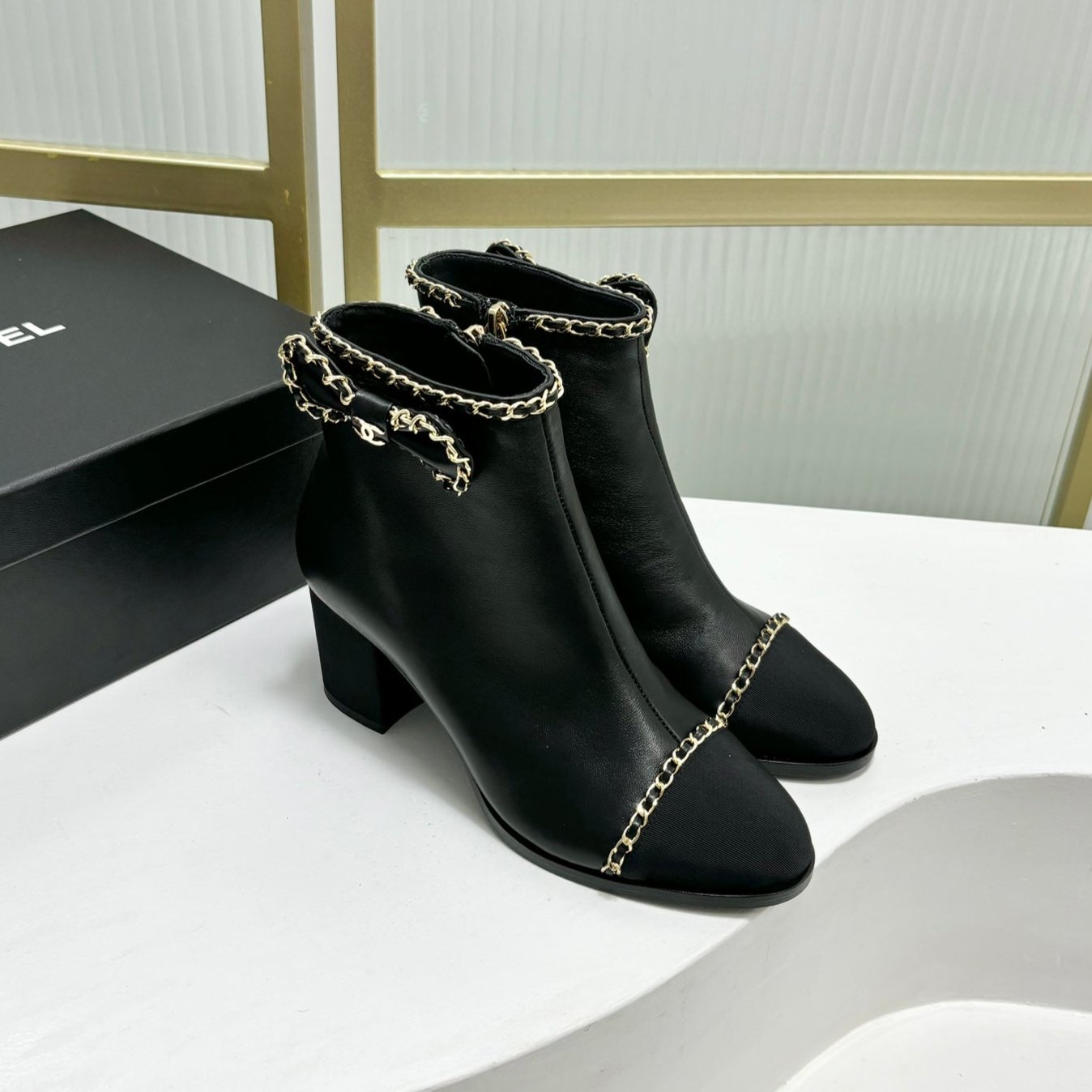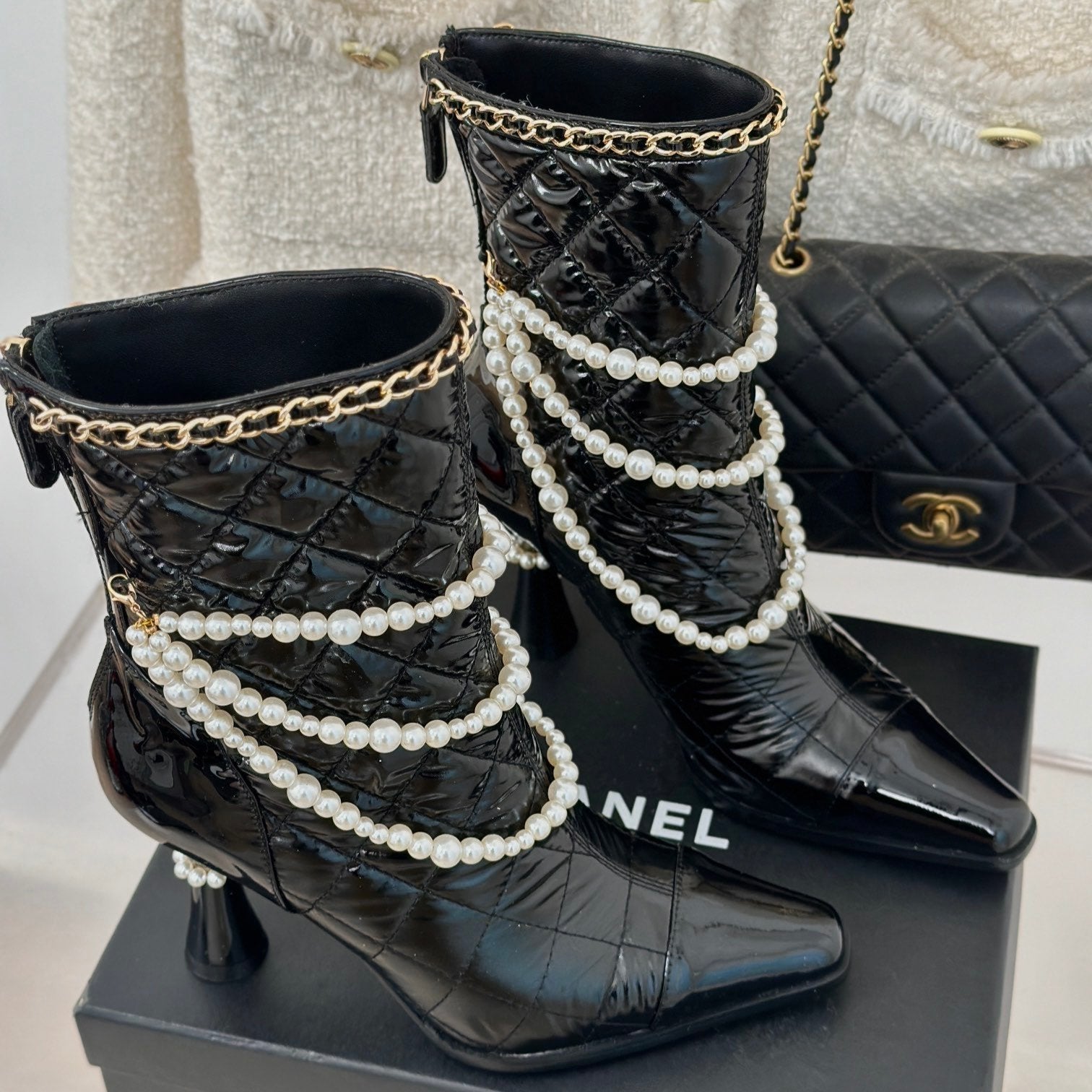 CC LOW CUT BOOTS IN BLACK STRETCH LAMBSKIN AND GROSGRAIN WITH PEARL CHAIN
