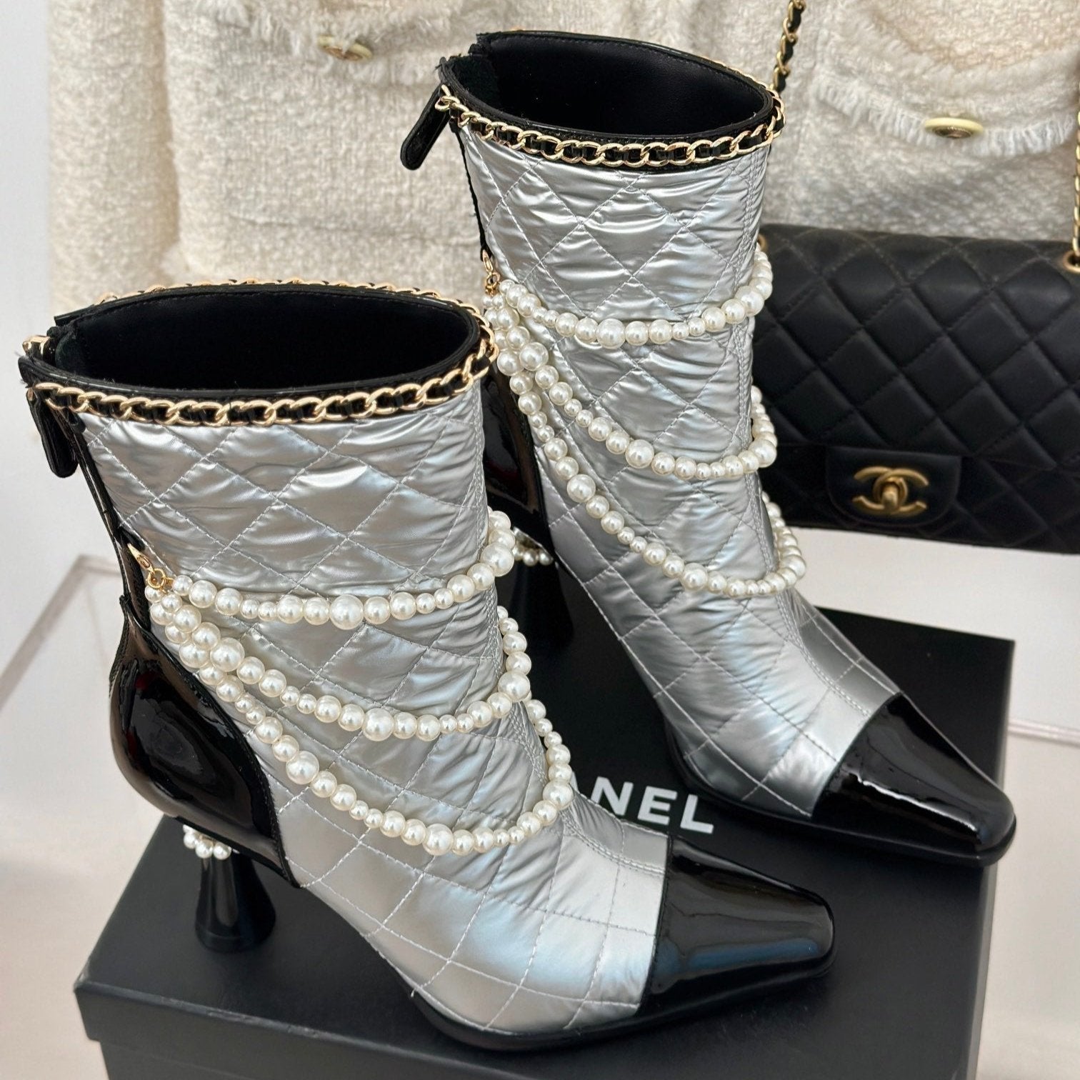 CC Short Boot Silver Metalic Lambskin Black Patent Calfskin