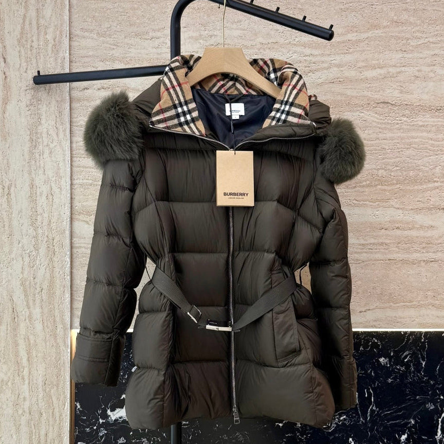 Burberry 25 Fur Collar Plaid Slim-fit Khaki Jacket Polyester Down