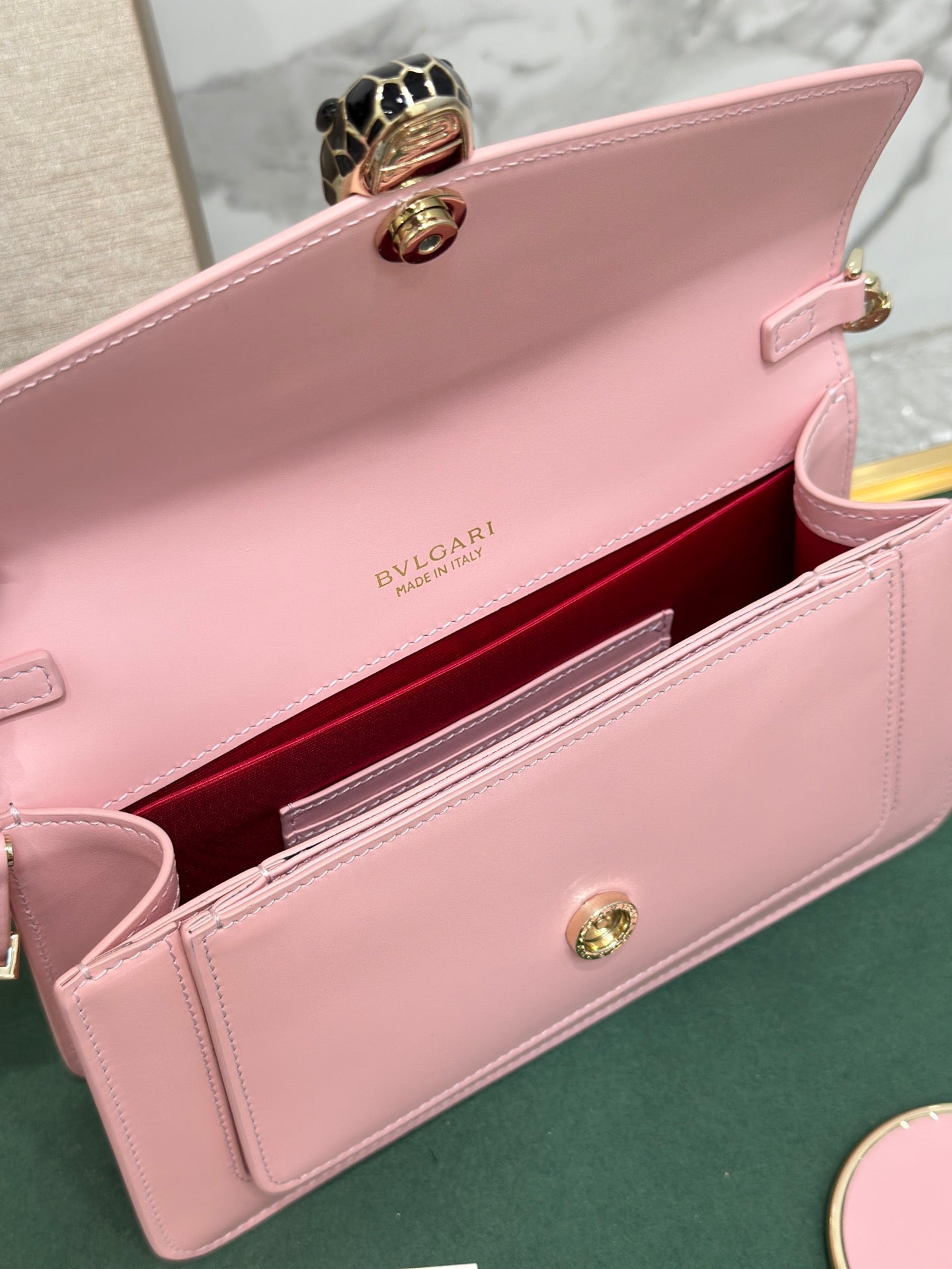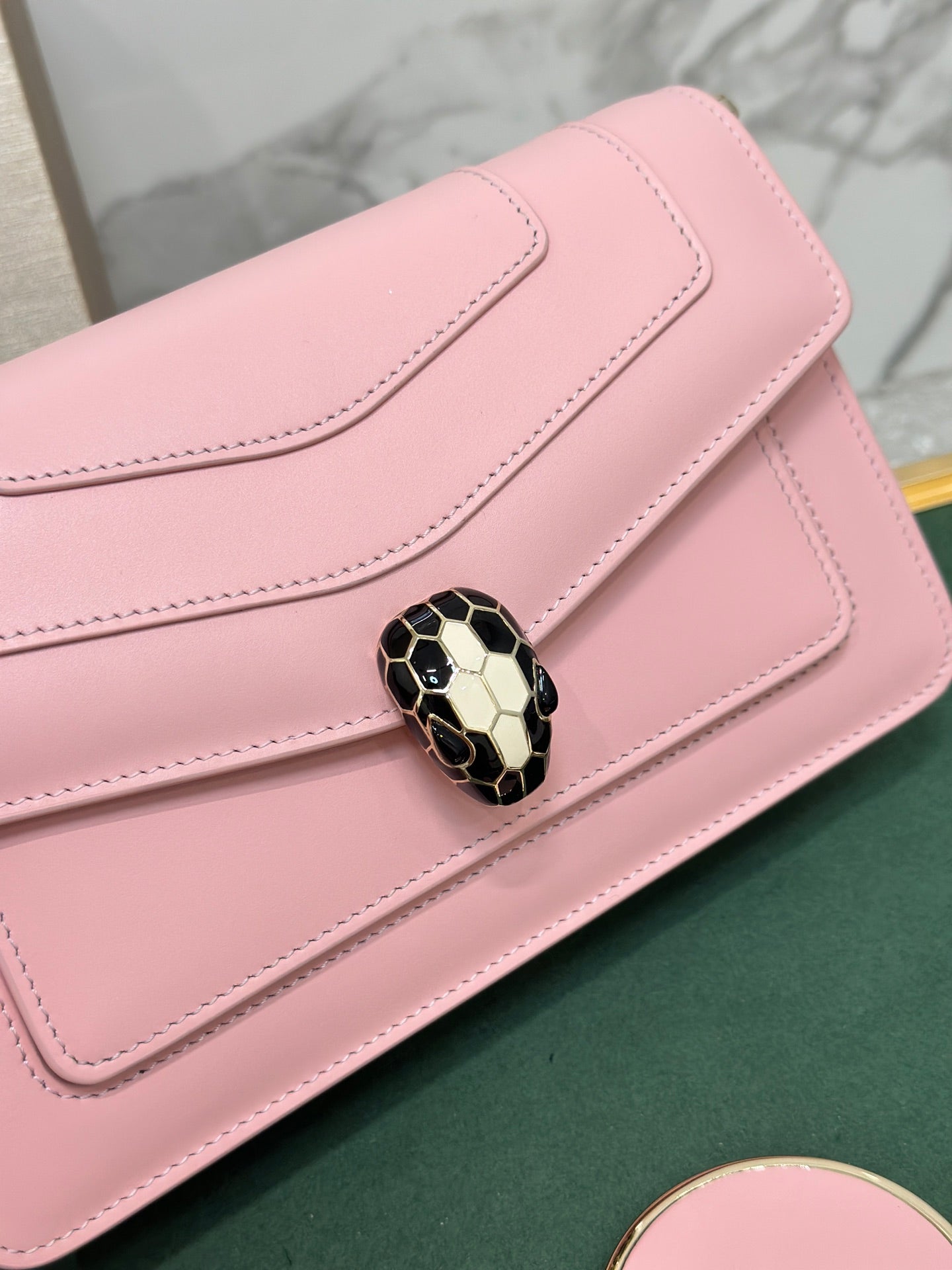 - Serpenti Head: Light Gold-Plated Brass, Black Enamel, White Enamel