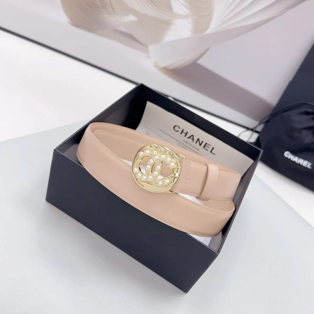 CC 30MM BELT IN NUDE BEIGE CALFSKIN GOLD HARDWARE ATTACH PEARLS