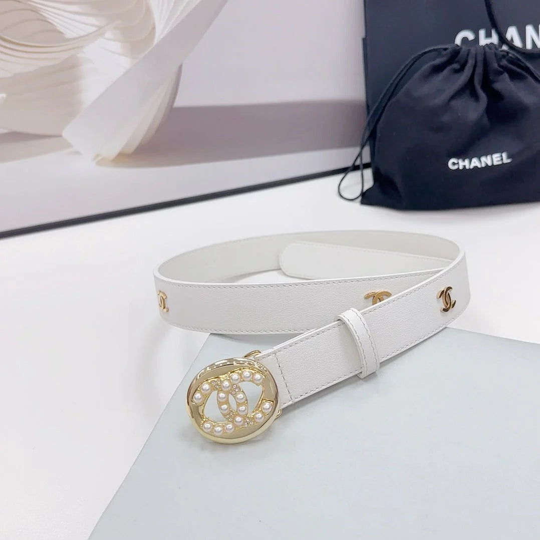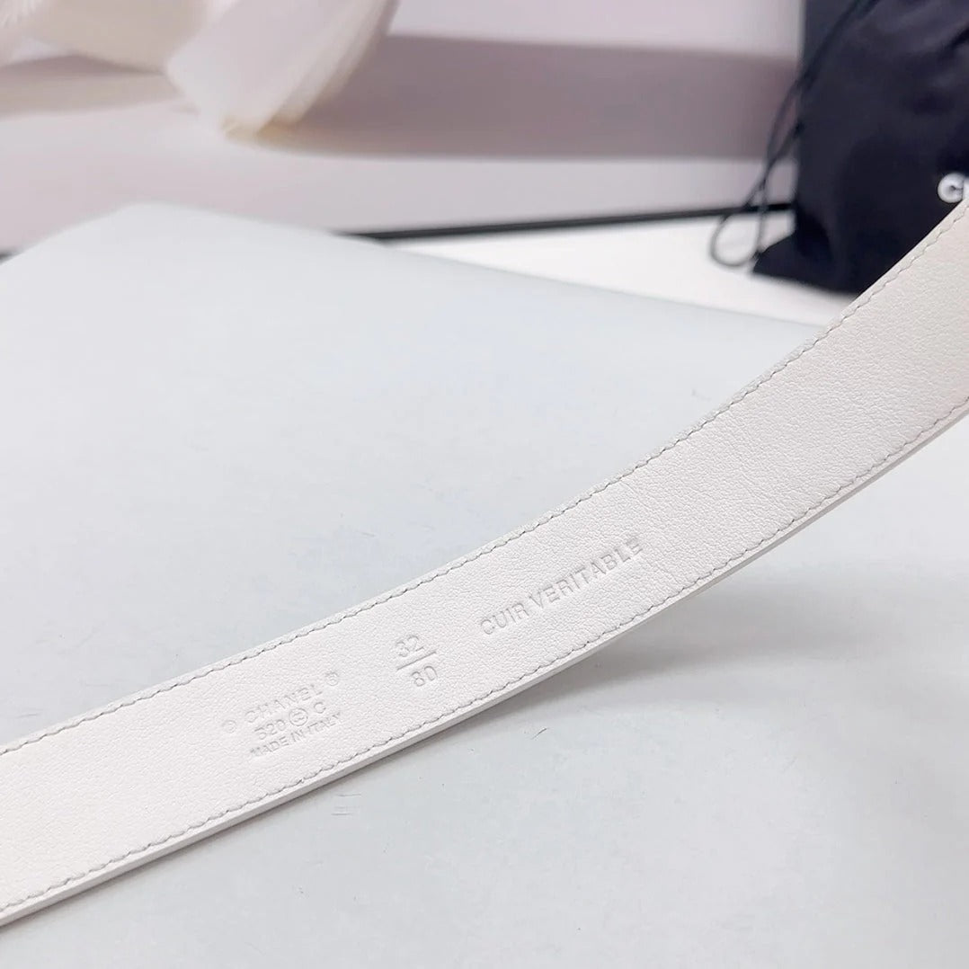 CC 30MM BELT IN WHITE CALFSKIN GOLD HARDWARE ATTACH PEARLS